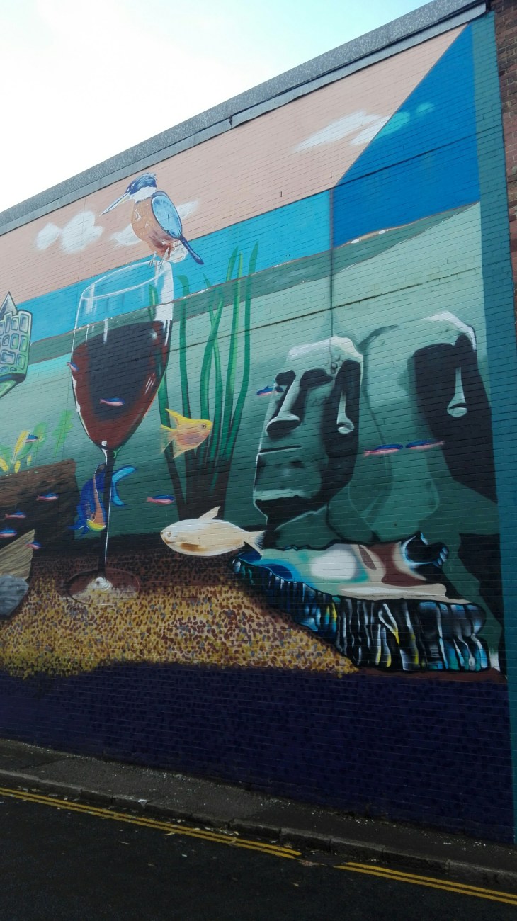 The “Fishtank” mural on the side wall of the Low Fell Removals depot references various items of local culture and heritage, including the glassworking heritage of Pyrex in the area, though I forget the significance of some of the items included in the piece.