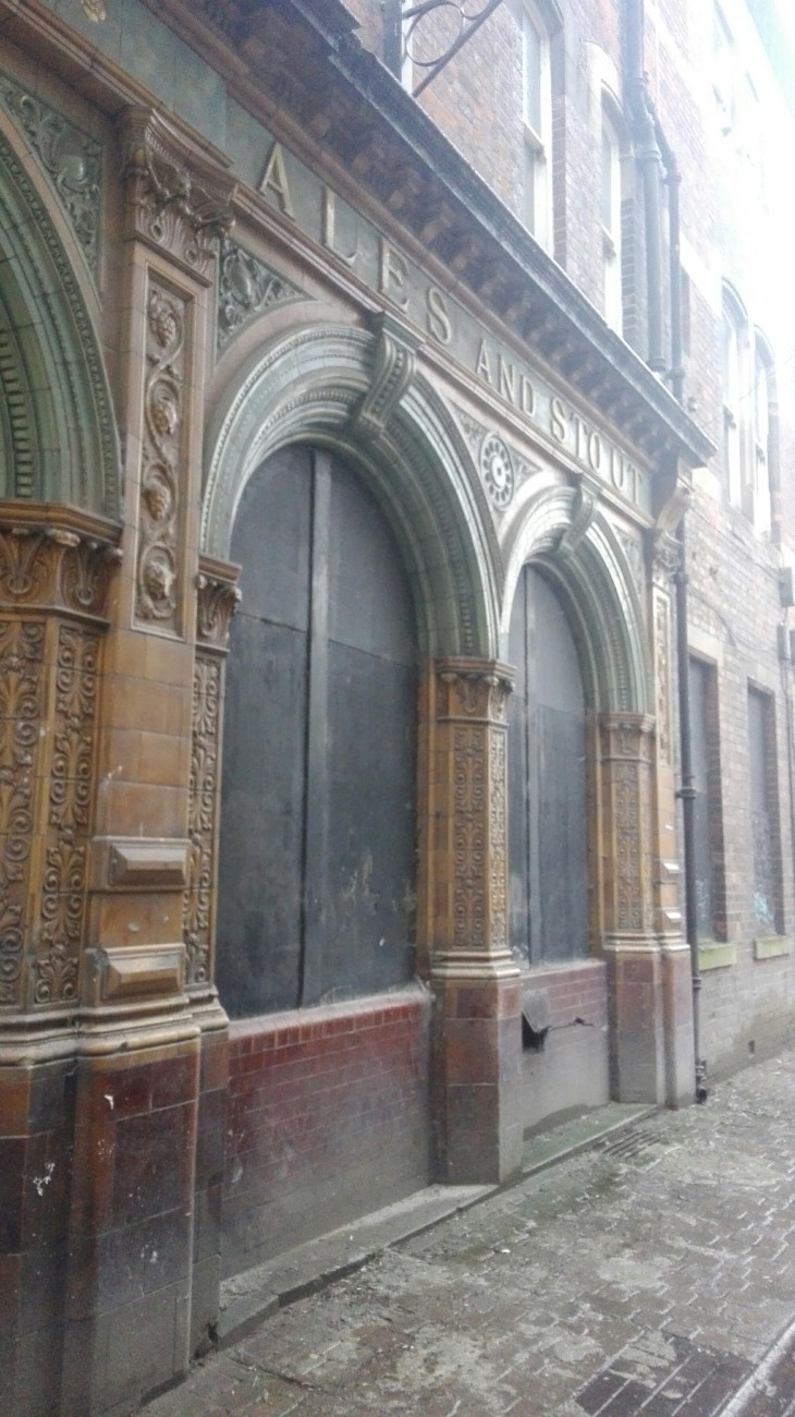 The ornate boarded up pub is located on Pann Lane. I don’t know the name it once had, as I don’t think it’s ever been open during my lifetime, but various online sources (is that cheating?) provide the title The Three Crowns.