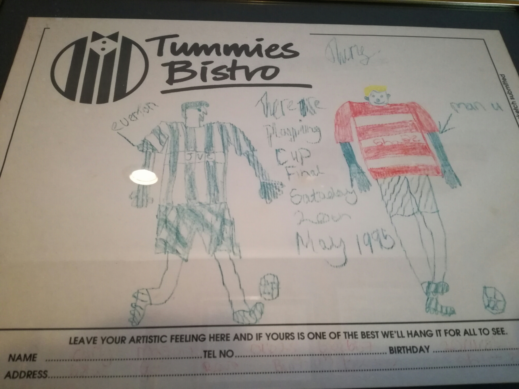 Better art was available in the wonderfully named Tummies Bistro, which I commend to all visitors to Bath Road and its collection of “bodyworks” (no idea) and bathroom shops. It’s a tremendous place, with some antique art near the loos. I like the idea of childrens pictures being left hanging up for ever.
