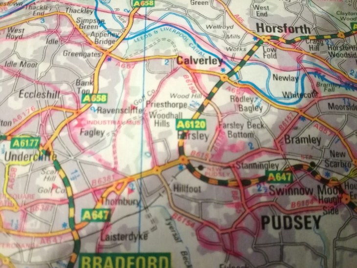 Despite staying in the Innkeepers Lodge at Calverley a few times, somehow I’d avoided the charms of Farsley itself until this week.  I’ll wager 99% of folk couldn’t place the town on the map. Here it is in the centre, obscured by the A6120 marking.