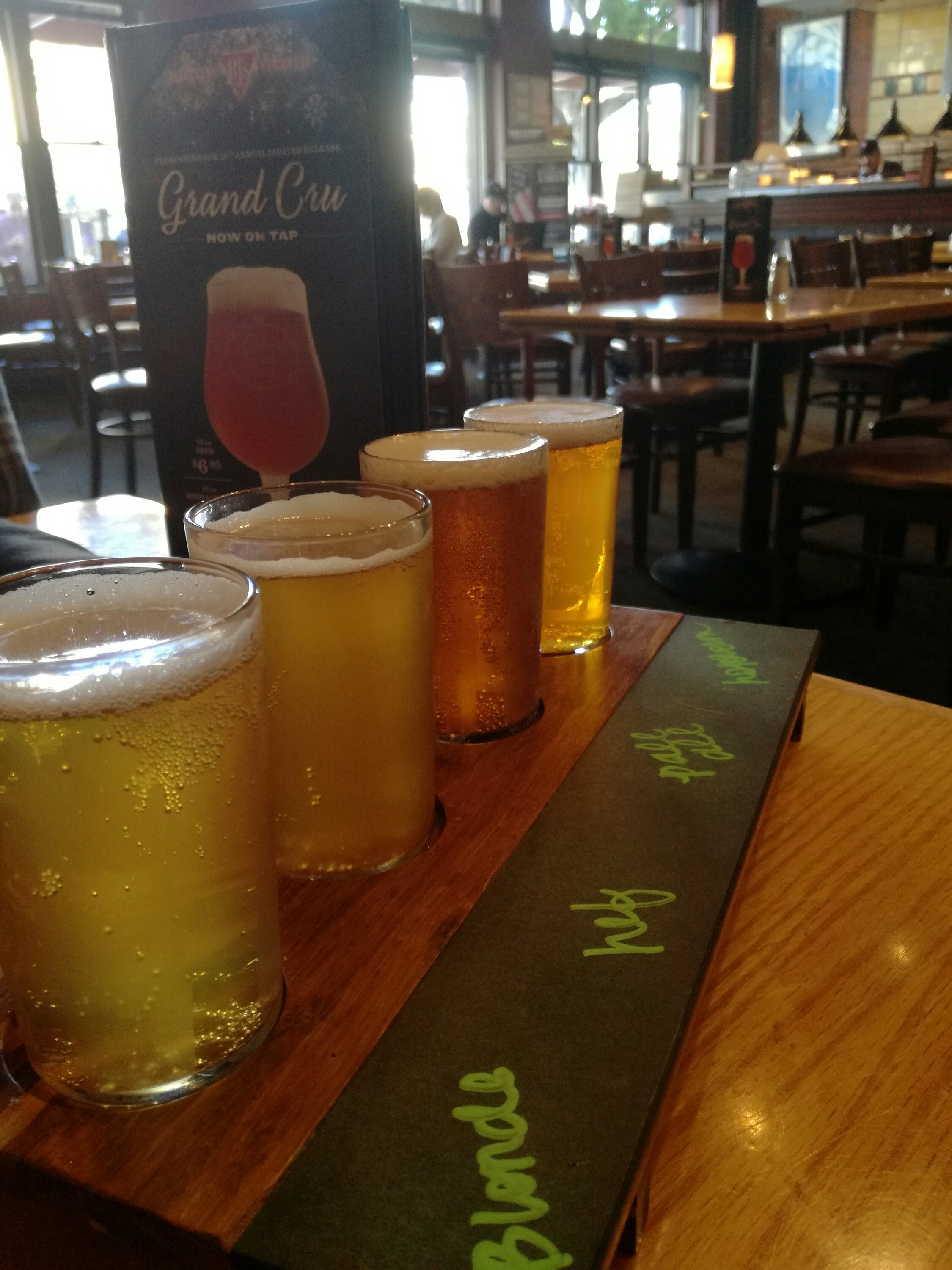 “Hi I‘m Sarah and I‘m your server today. I recommend the Draught Bass, sorry sampler flight“.