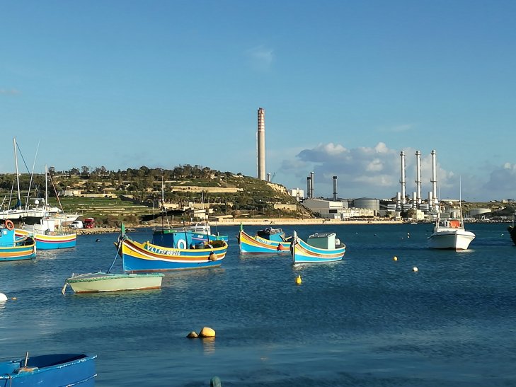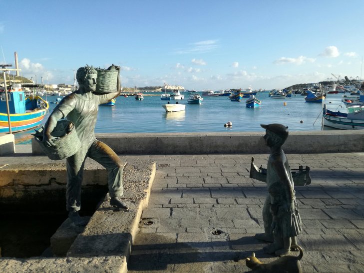 Marsaxlokk (above) on the south Maltese coast is one of the few towns of less than 10,000, but apparently doubles its population when the sun shines. Which hasn’t happened yet.