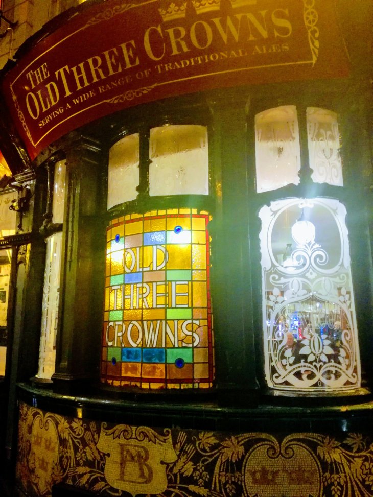 Duncan had alerted me to the windows next door on the Three Crowns, and I stopped in the drizzle to admire them now.