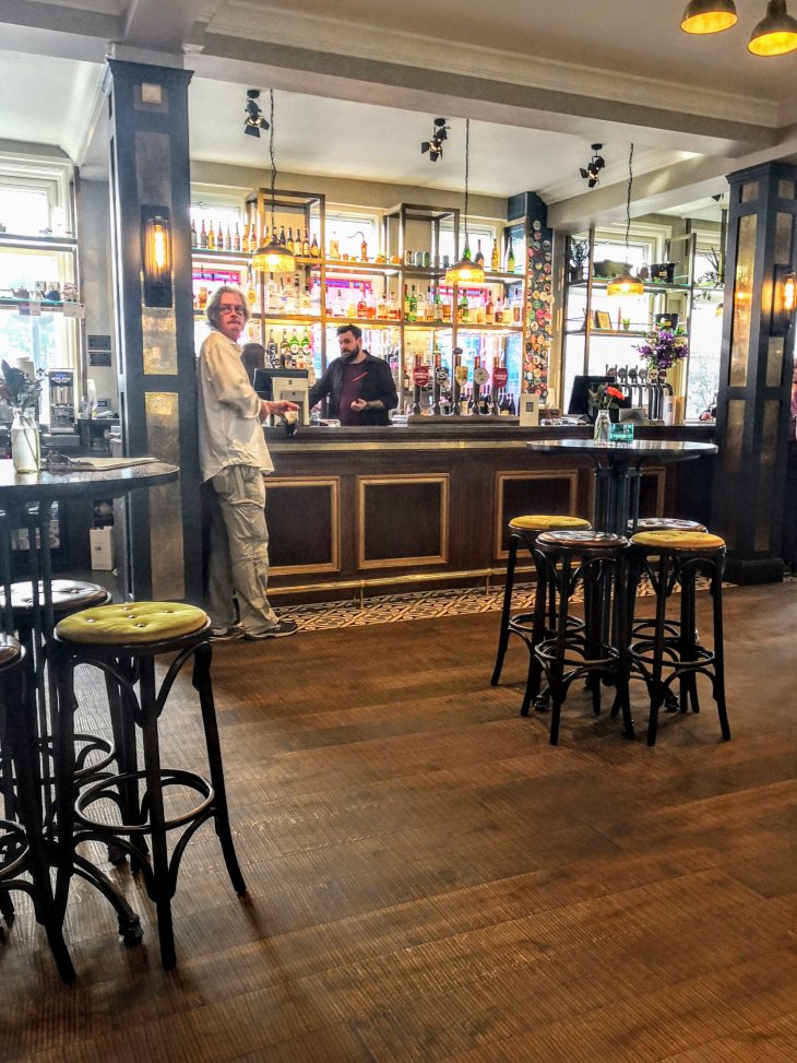 Nice staff, fresh flowers, foaming Pride, Curry Charles in soft focus discussing haggis hunts in the Highlands with Joan.