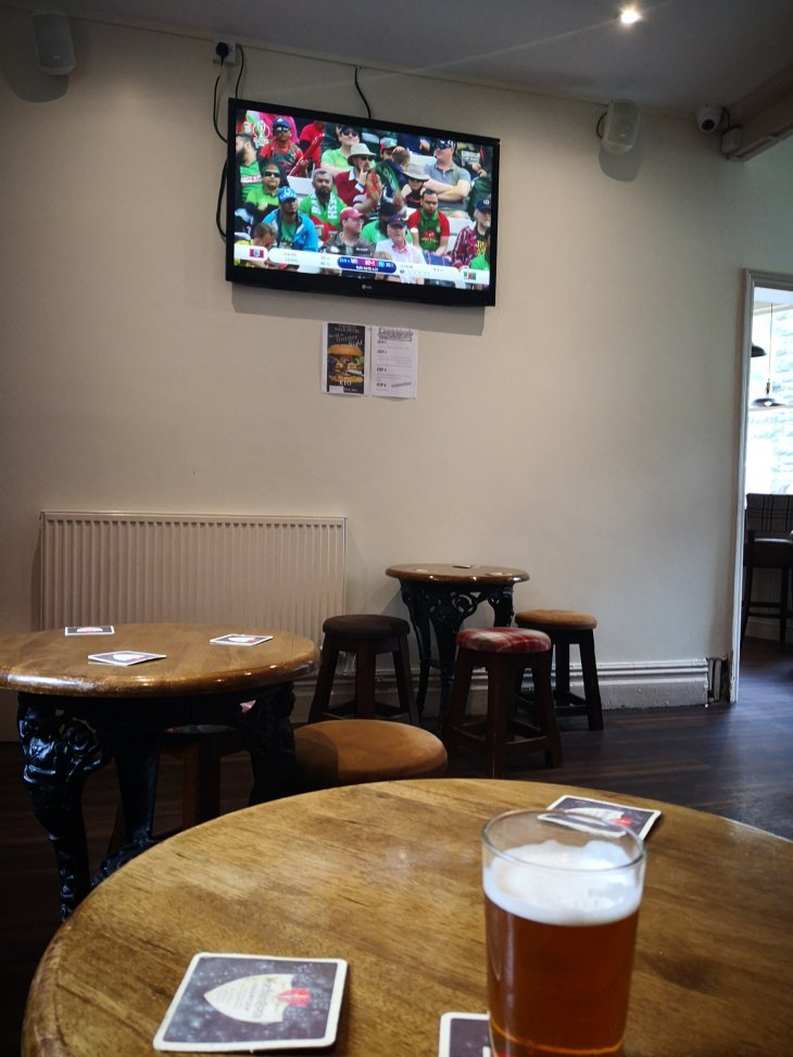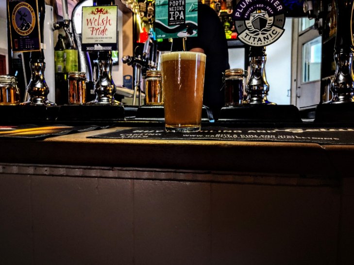 Monday lunchtime, when most Welsh pubs are either closed or accepting diners only, and here were Professional Drinkers, alongside folk enquiring about “Build-a-Burger”.