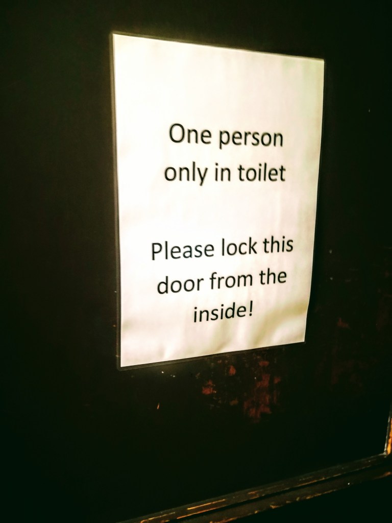 I’ve seen quite a few Gents toilets with that “One in, one out” rule, but the Maypole was the first to insist I bolted the door to the urinal, to the dismay of the Colonel with a weak bladder behind me.