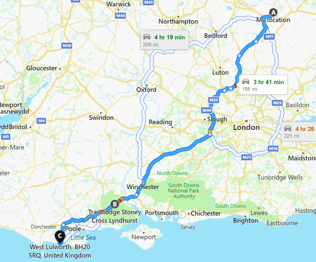 Four hours later we were approaching the Dorset coast, only briefly detained by that English need to make ourselves a cup of coffee in the New Forest.