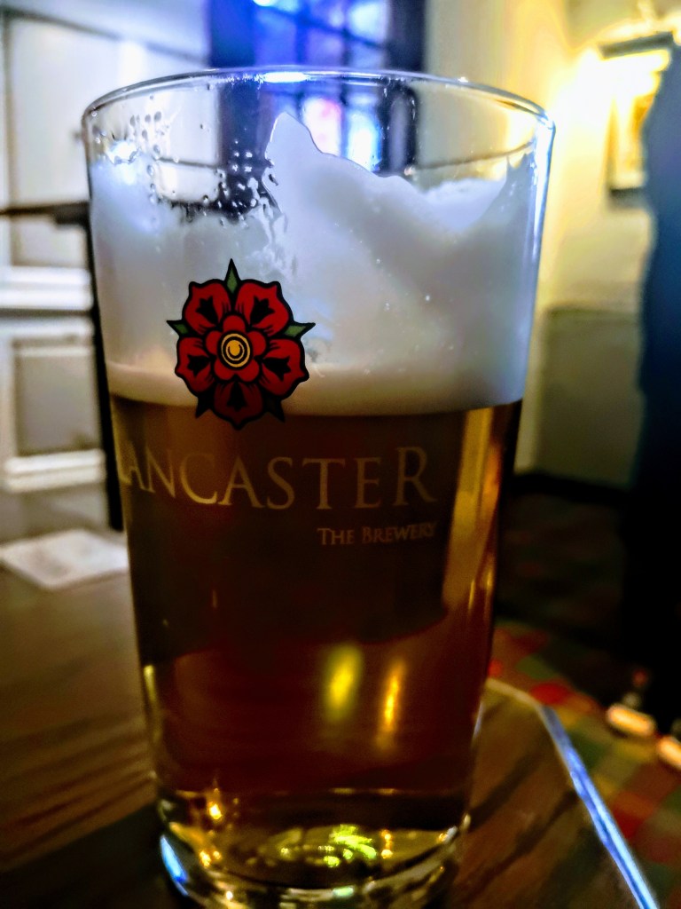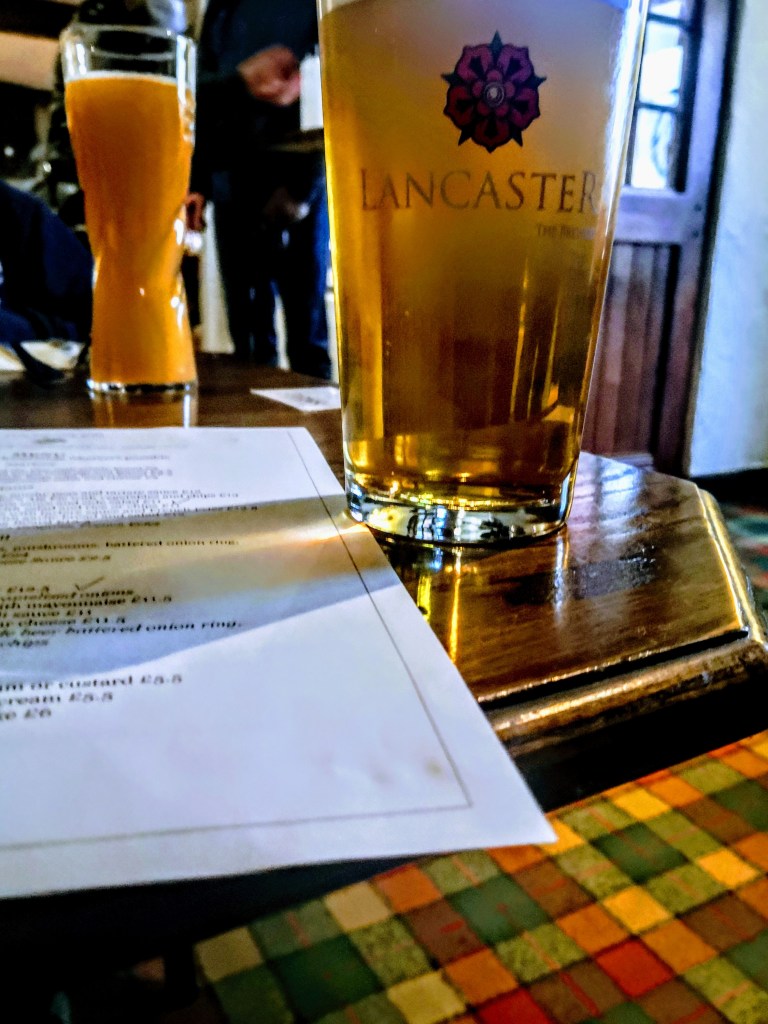 Proper Pub food, scampi and chips for me, and a superbly crisp and foamy Lancaster Blonde (NBSS 3.5 +).
