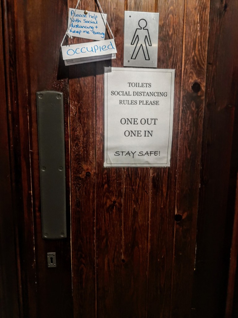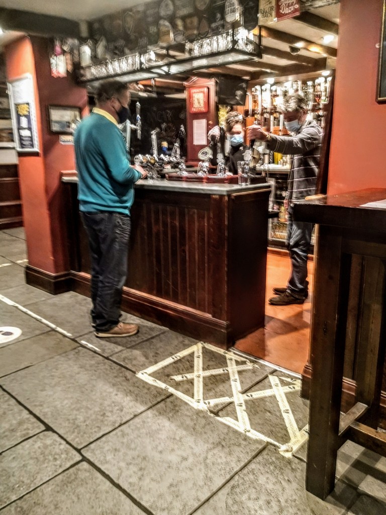 A lovely old rambling South Lakeland pub, except now with the addition of handwash, QR codes, perspex visors and sticky tape.