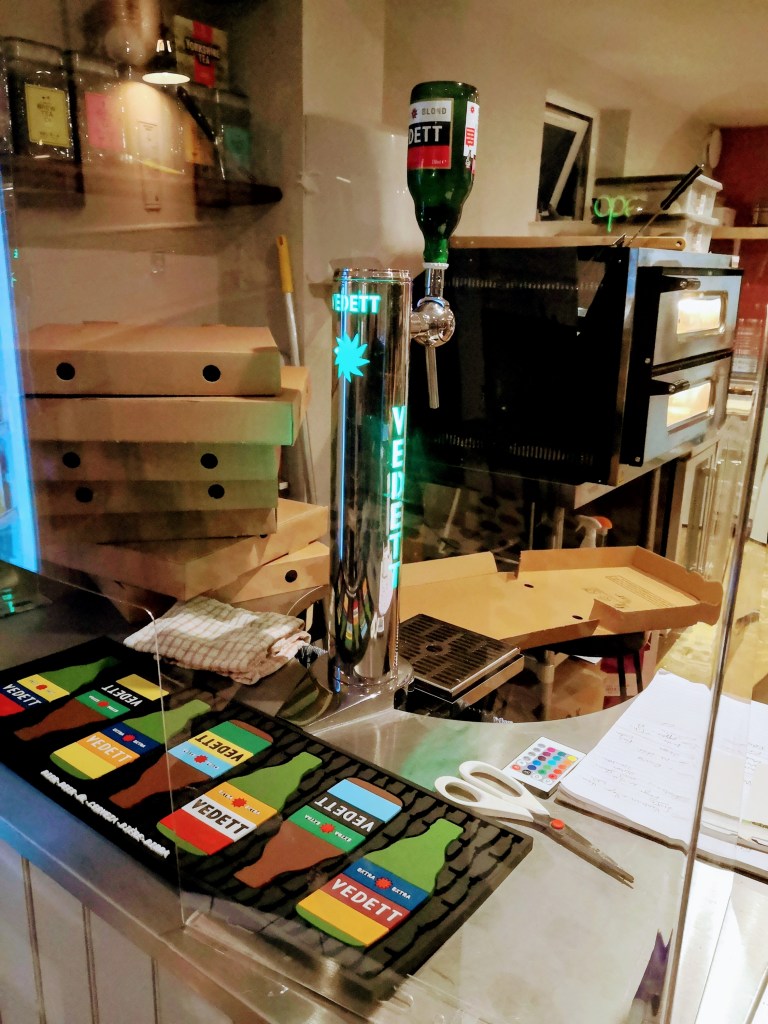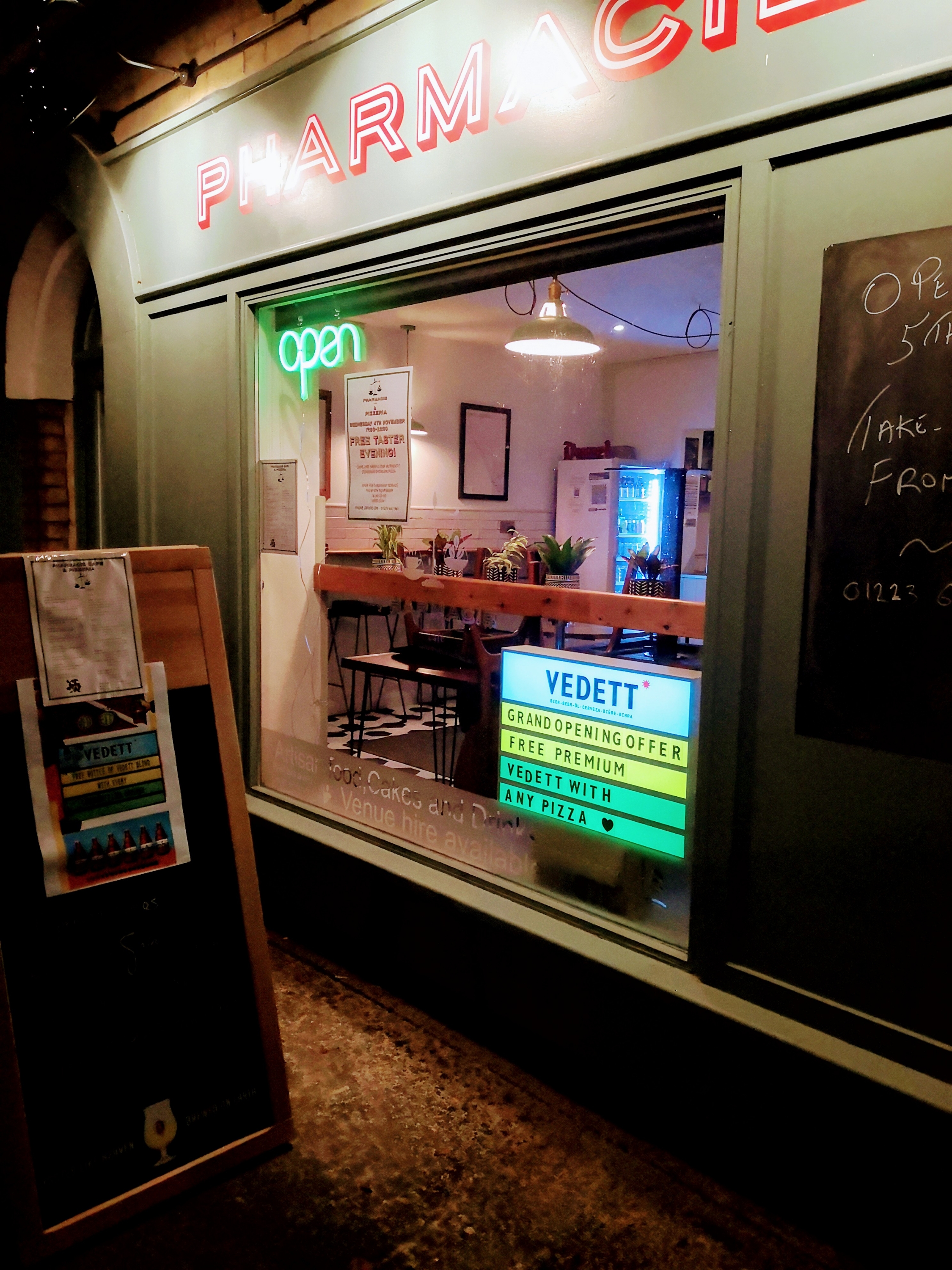 Only now do I read that Waterbeach’s pharmacy-turned-cafe is now a pizzeria with Vedett (pronounced as in the Steeleye Span Christmas hit) on draught had finally opened that night. And closed at 10 the same evening.