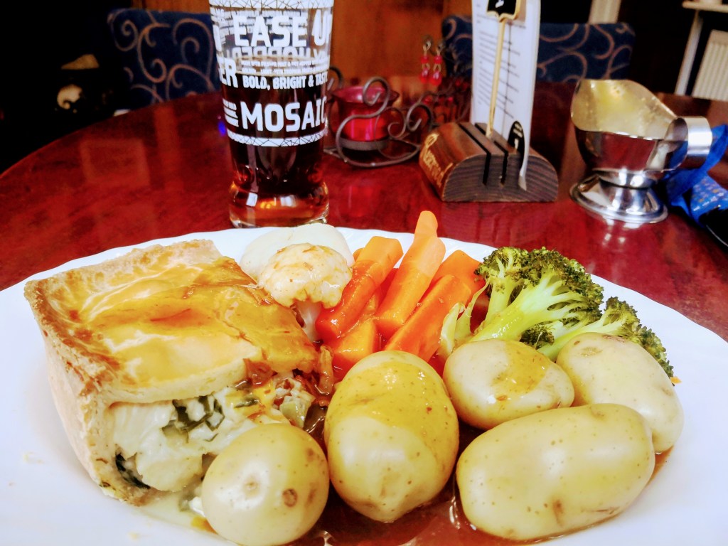 Let’s not complain. Both the Adnams (NBSS 3.5) and the Chicken & Leek Pie with individually matched gravy boats were superb.