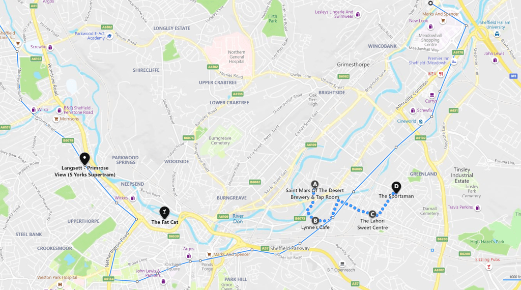 I’ve marked the tram route from Hillsborough to Meadowhall; as soon as non-essential travel (if you can call pubs non-essential) is allowed I’ll be jumping on trains and trams again.