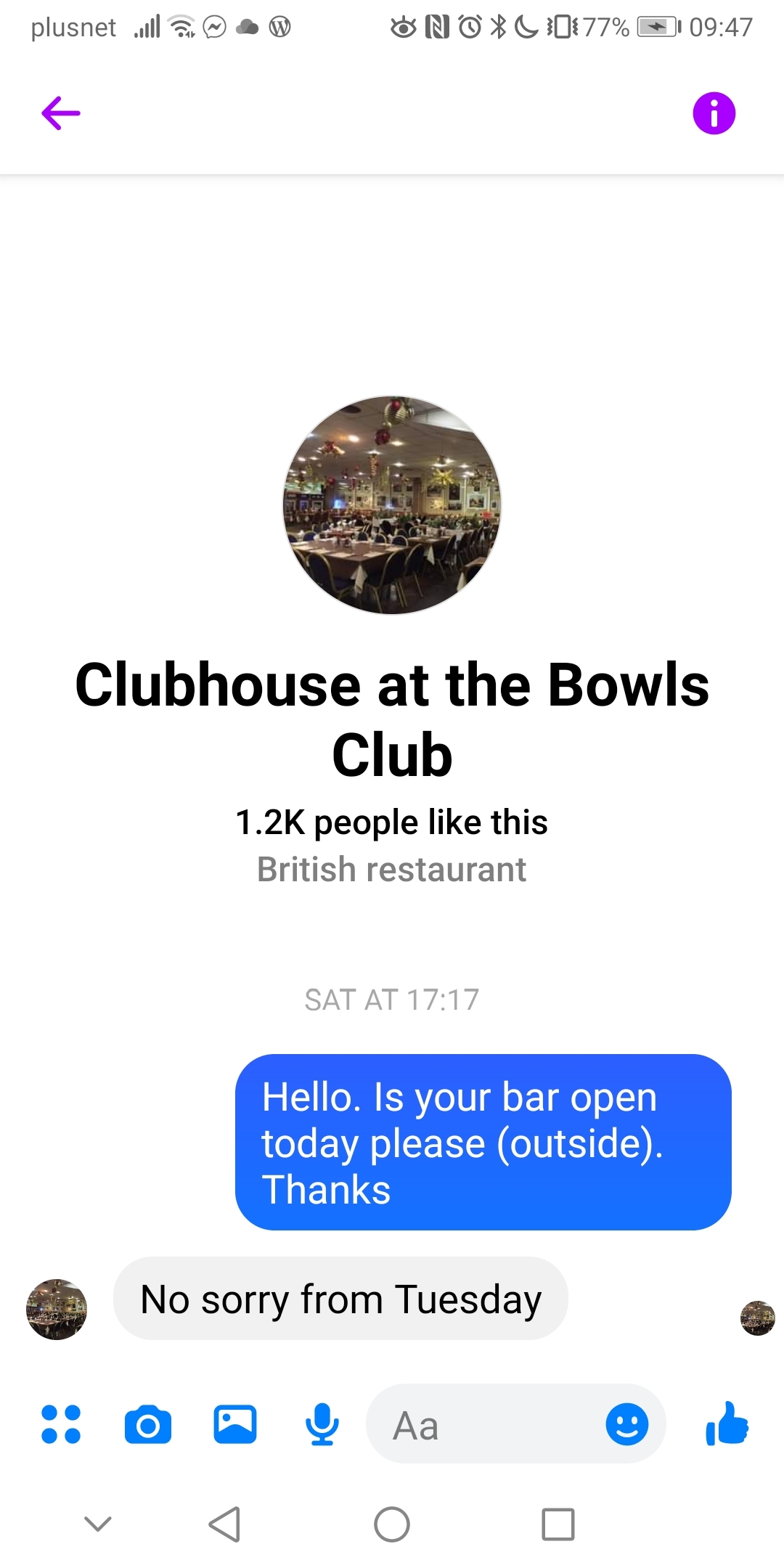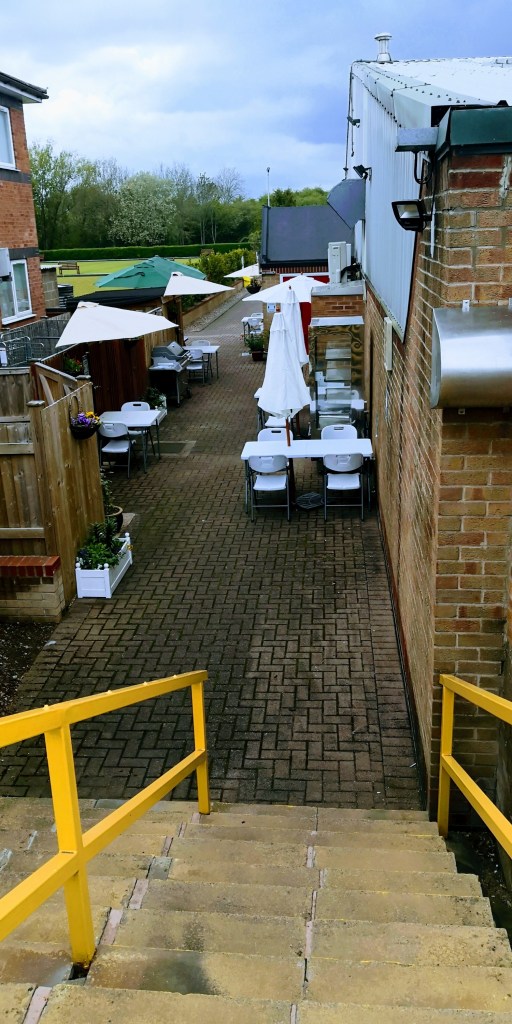 It wasn’t open, of course, the doors locked and no-one about despite a scattering of outside table. And to be honest Google Maps was screaming “It’s closed, you fool” as I completed the mile walk out of town. Why on earth would an indoor bowls club be open the weekend before the Heaventeenth of May ?