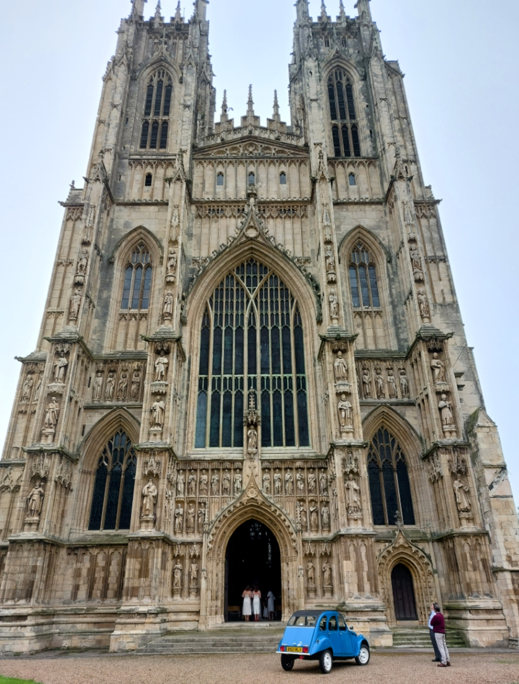 Beverley was the busiest town I’ve seen this year (average age 67), though oddly few of the visitors were attracted by the Minster, where a bride had just arrived by what looks like a blue 2CV but I’m no car expert.