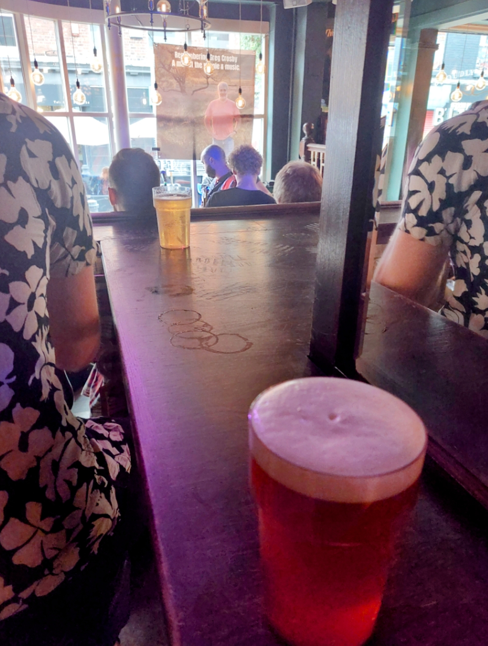 The plastic glasses are tougher than the ones in the Washington, they’d hurt if they hit you on the ear, but do little for an OK pint of Abbot I drink far too quickly before unwisely moving on to the Crow, just as I did when ignoring Simon two months ago.