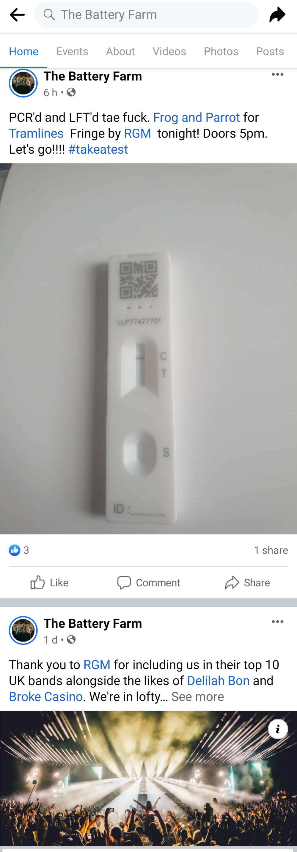 It’s all Greene King beers and pretend guests that are actually Greene King these days, and a small stage near the door for Manchester punk bands like Battery Farm to educate us and blast our ears off. They kindly shared their lateral flow test with us on Facebook; I like the personal touch.