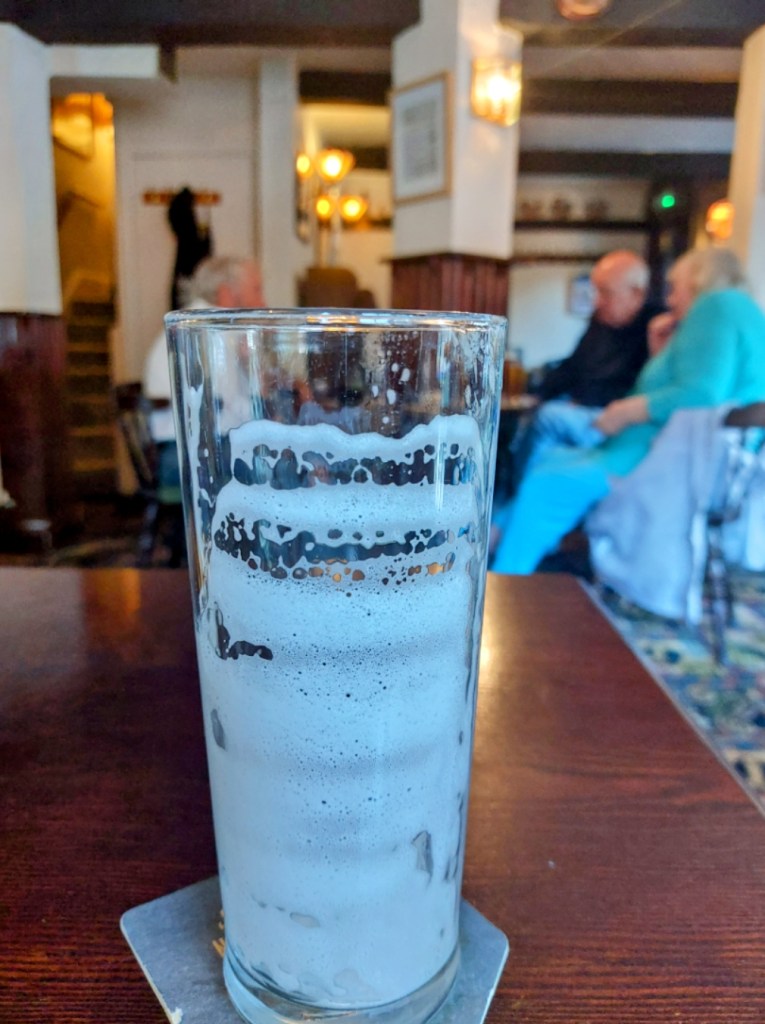 OK, no Banks’s Mild on electric pump, but a lovely glass of Big Bog (see lacings) for £3 when the average pint round here is probably £4.52. Perhaps because the beer is so cheap, I hear “And your own” a few times, a northern speciality.