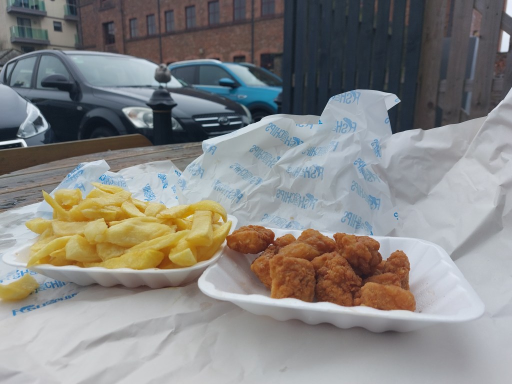 As was the queue for Fraser’s chippy next door, from which I sneaked a tray of squid and chips I forgot to share with Mrs RM. On the scenic outside table a grumpy lady stormed past, moaning about slow service. 18 months on, we have squid, we have cask, and still people moan.