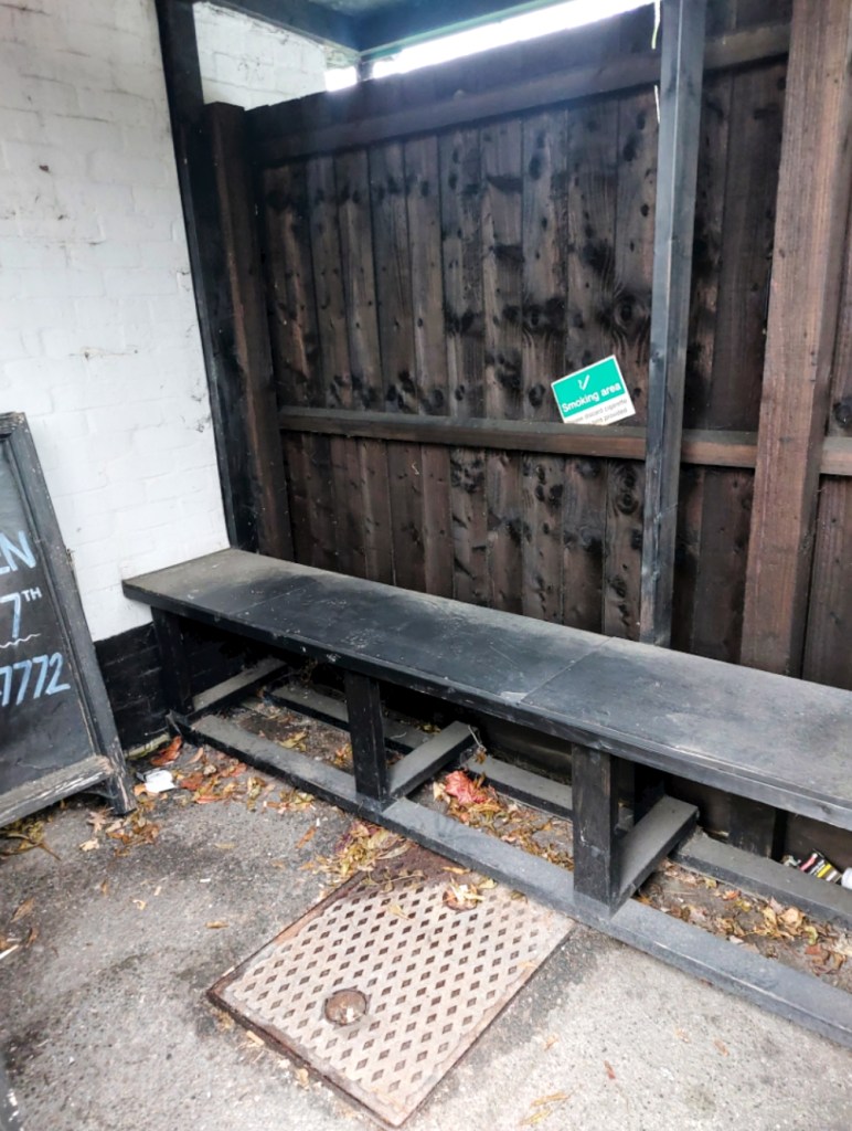 Actually, there was a play area-cum-garden, but I didn’t fancy battling the reversing Ford Cortinas to get it, so I bring you a rare shot from a UK smoking shelter (top).