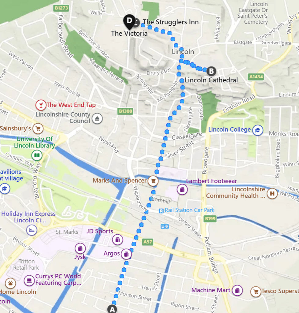 Pauline nearly guessed right, I did look in the window of the Strugglers, named after the ascent from the Wetherspoons to the pubs at the top of the hill.