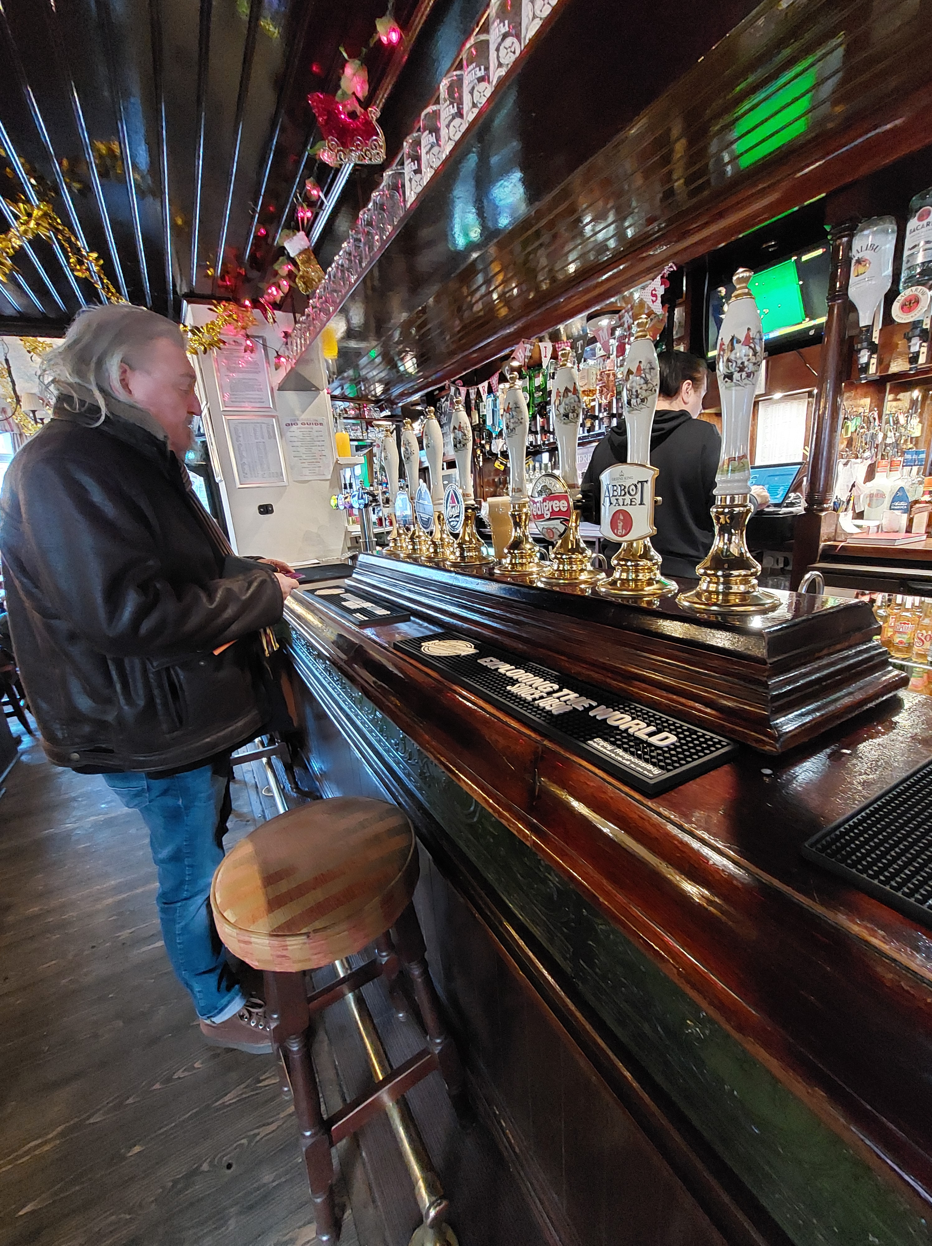 You could do a crawl of Britain’s great beers just standing at the bar. Abbot, Pedi, Bass, Courage, and whatever that is at the far left, possibly cider.