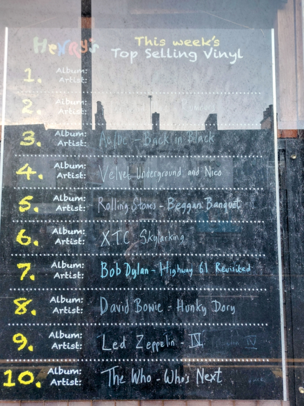 That went down a bit too quickly, meaning my first tick still wouldn’t be open, so I paused at Henry’s record shop to see what vital new music was selling fastest in Burton.