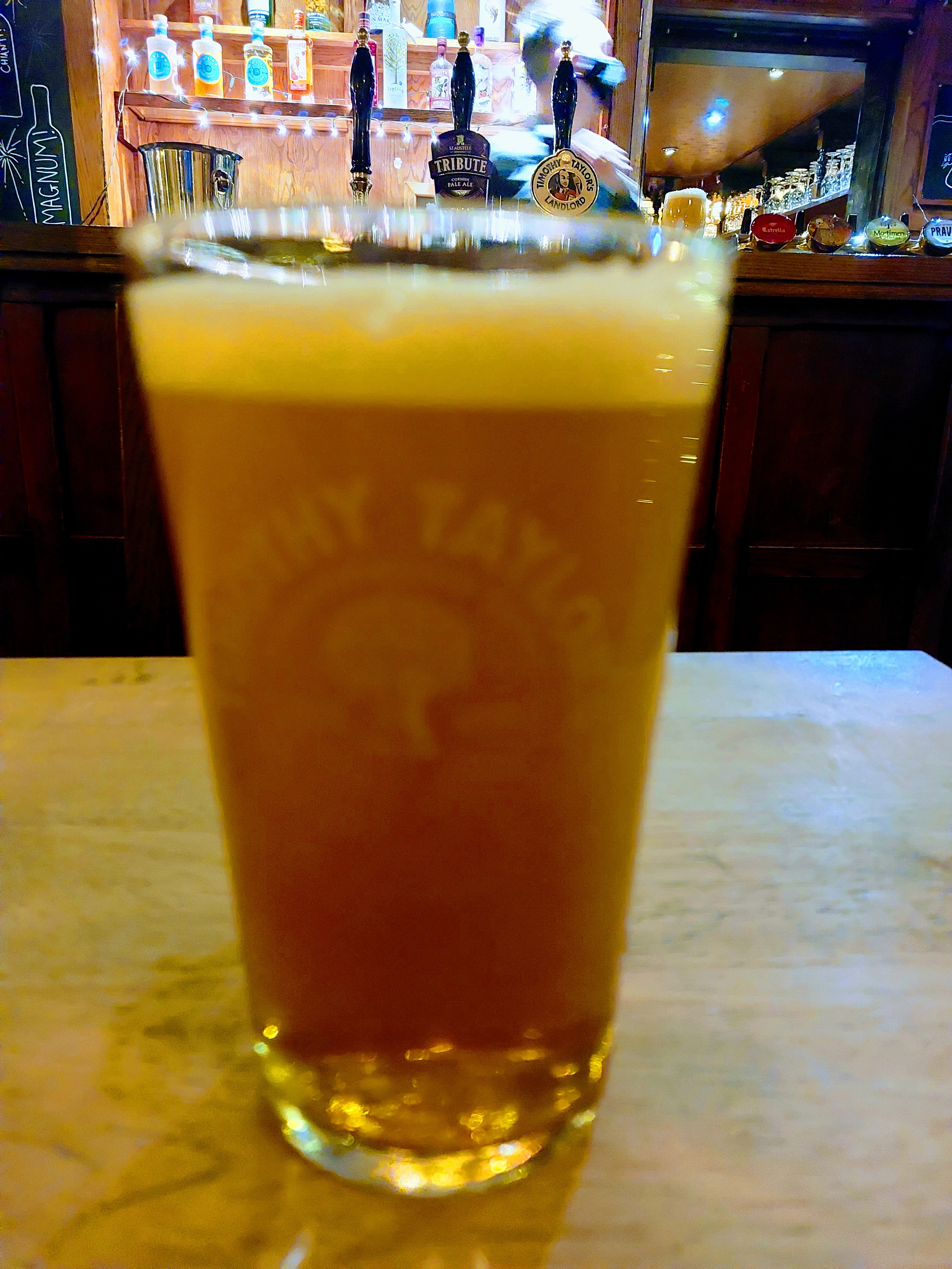 A very decent pint of Landlord, crisp and foamy (NBSS 3.5), at the standard London price of £5.40. Seemingly the beer of choice for the locals and visiting actors, one of whom was tapping his fingers to “Living On A Prayer“.