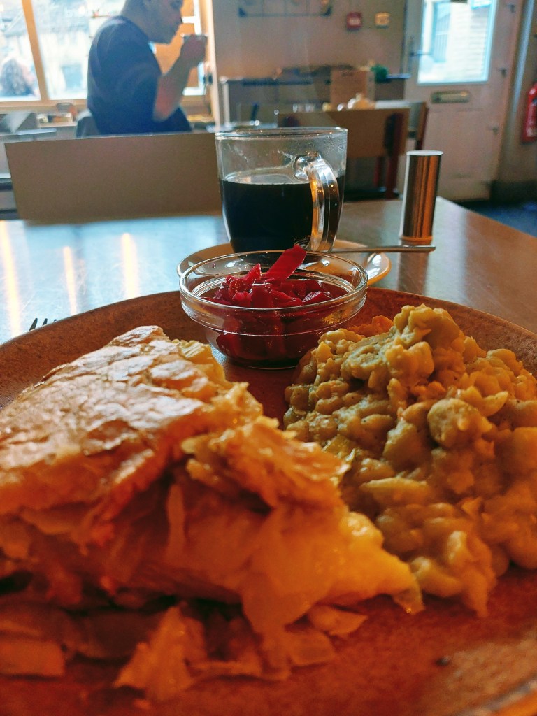 I stopped in the Kindness Cafe near the river, a wonderful little place playing “Green Onions”, where my Healthy Eating Diet continued apace with this Cheese & Onion pie and mushy peas with pickled cabbage combo.
