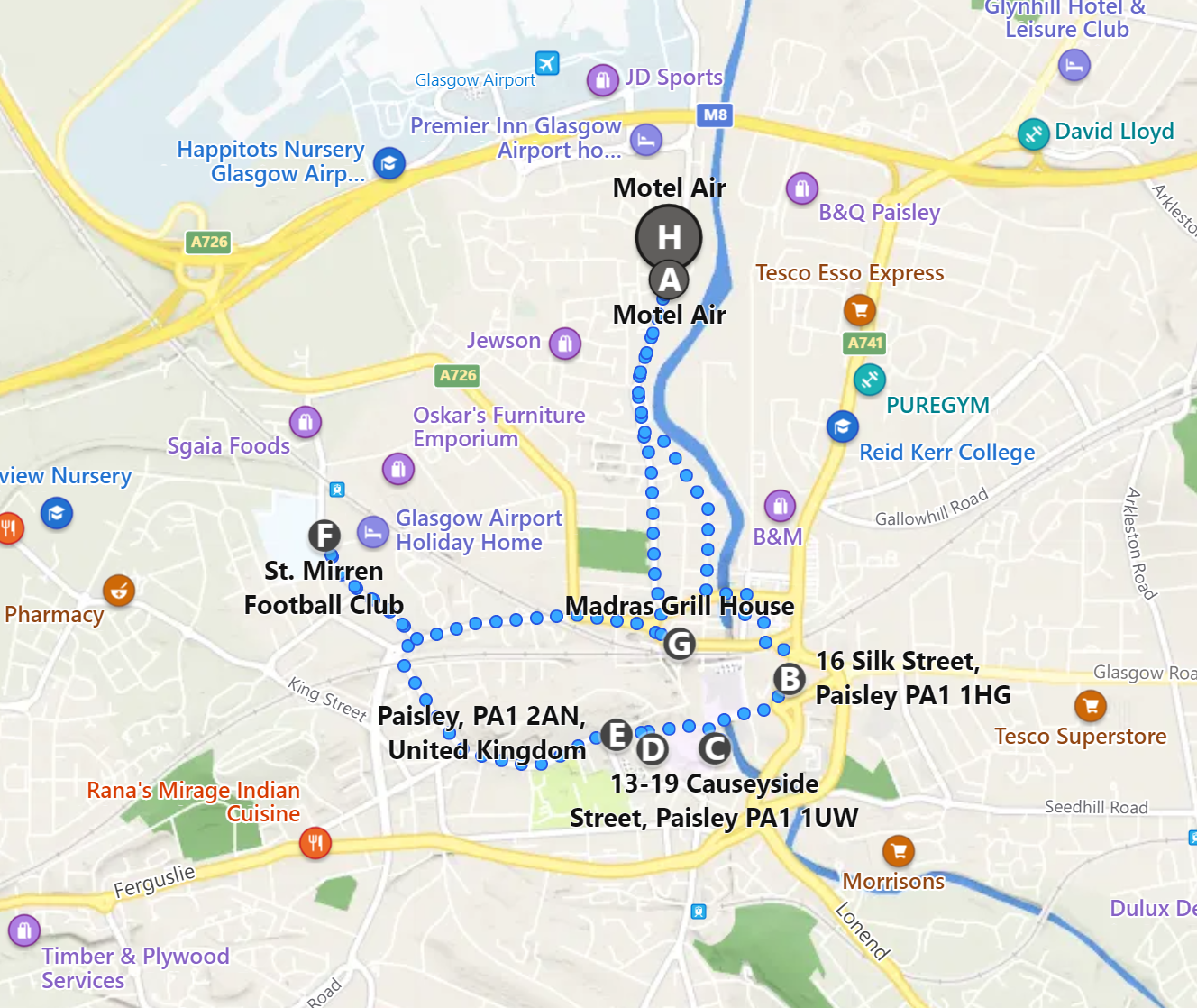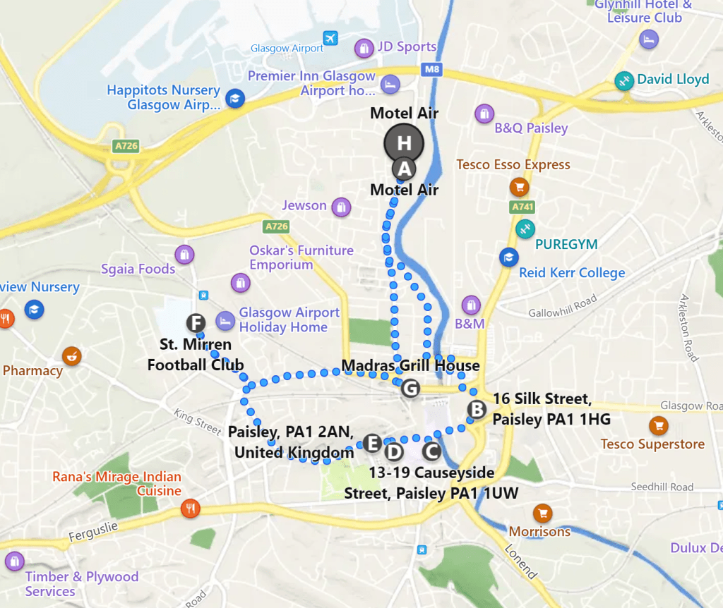 Bing Maps doesn’t recognise the names of half the pubs we visited, but stop (C) takes us over the river (is it really called “White Cart Water” ?) to my tick.