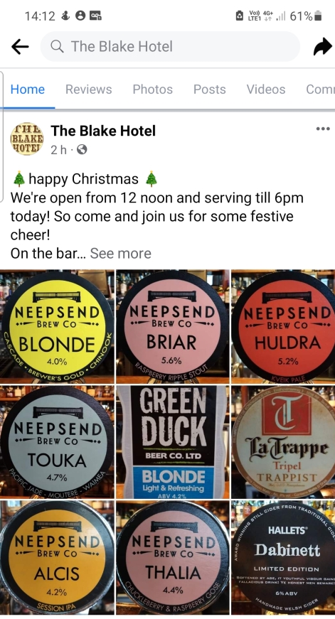 I had left the Blake about 45 minutes before you arrived, it would seem. I can’t drink those strong beers that you and Christine go for – let’s just check my notes, what did I have? Oh yes. La Trappe Tripel 8% – a couple of halves. I can’t seem to drink those keg beers by the pint.
