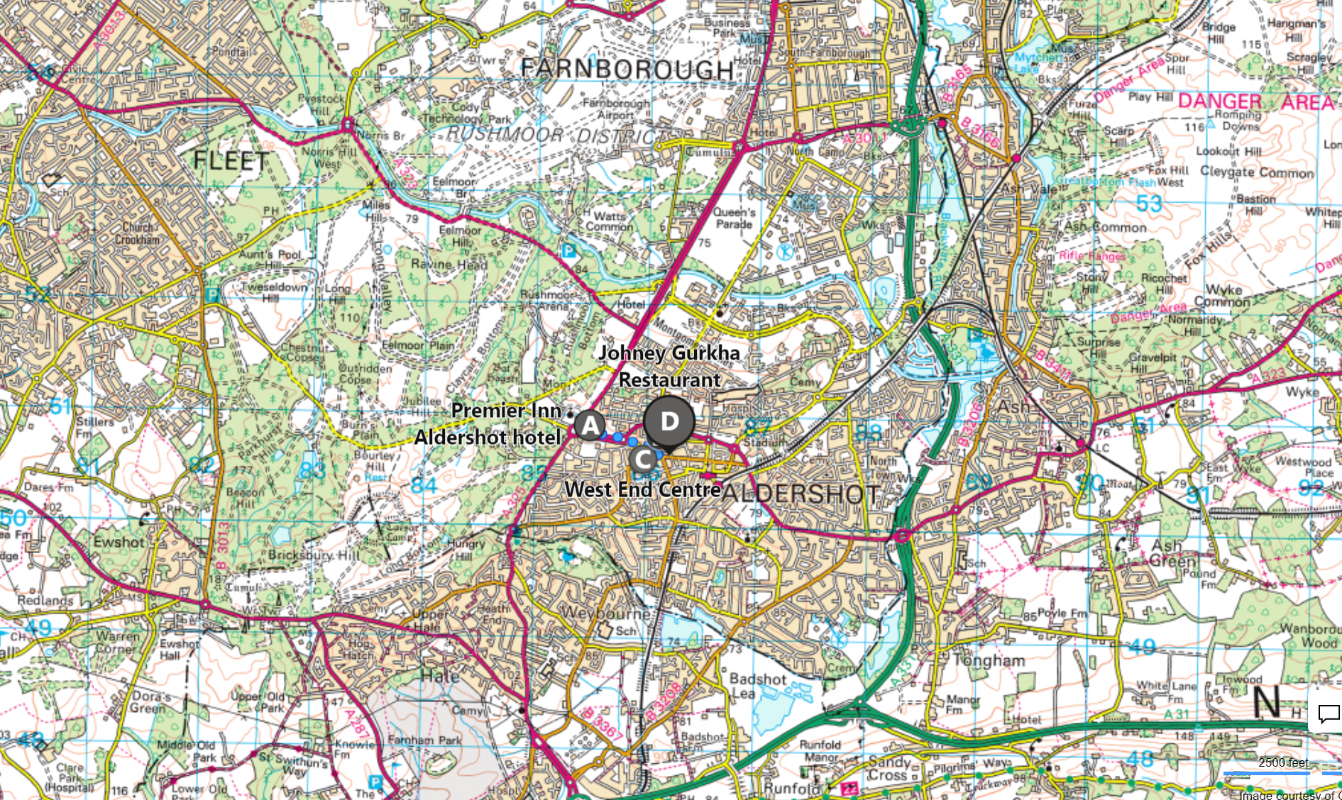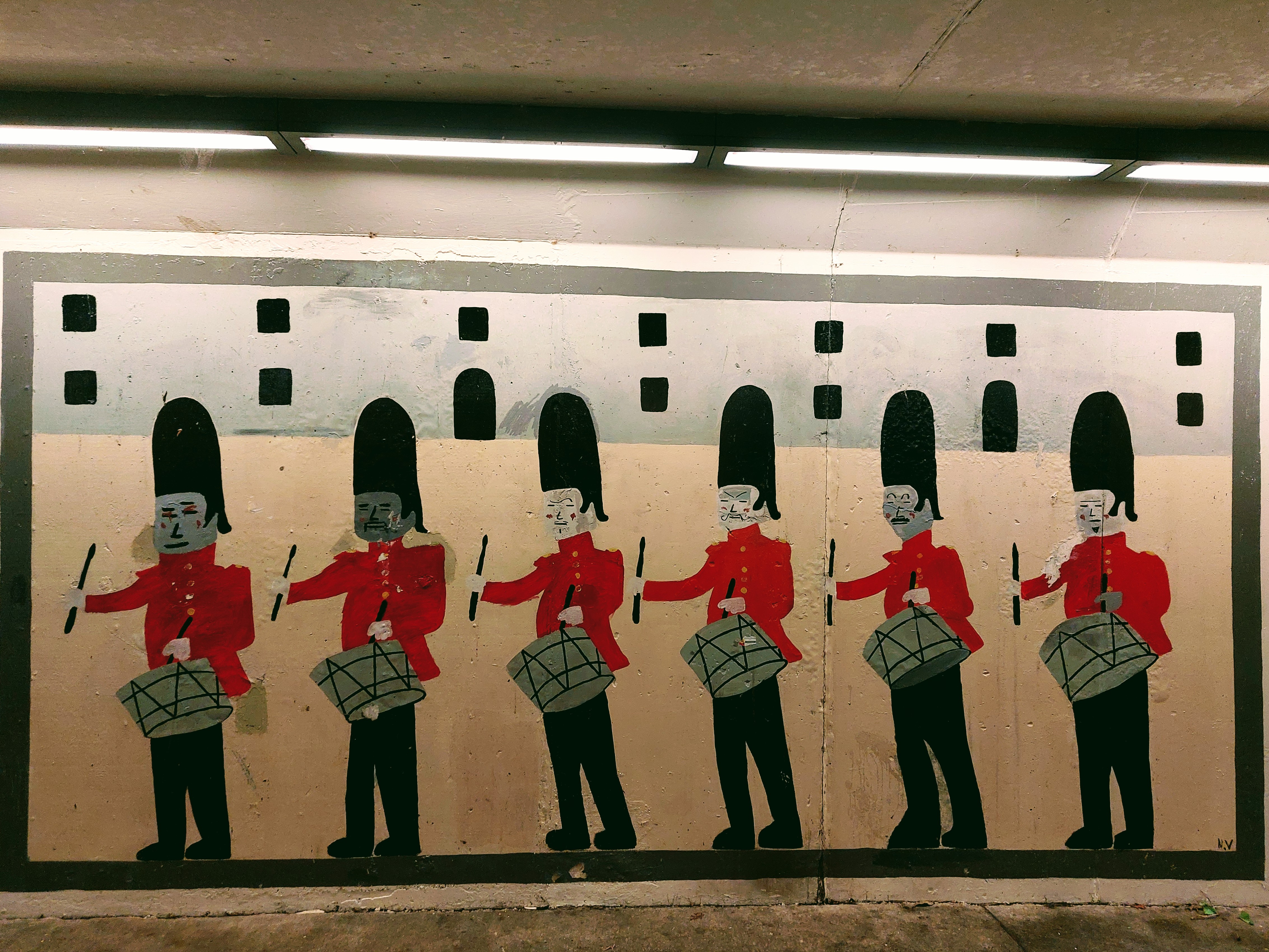 There’s drizzle in the air, it is Hampshire, and I’m grateful for the respite offered by the underpass whose art reminds me Aldershot is a military town.