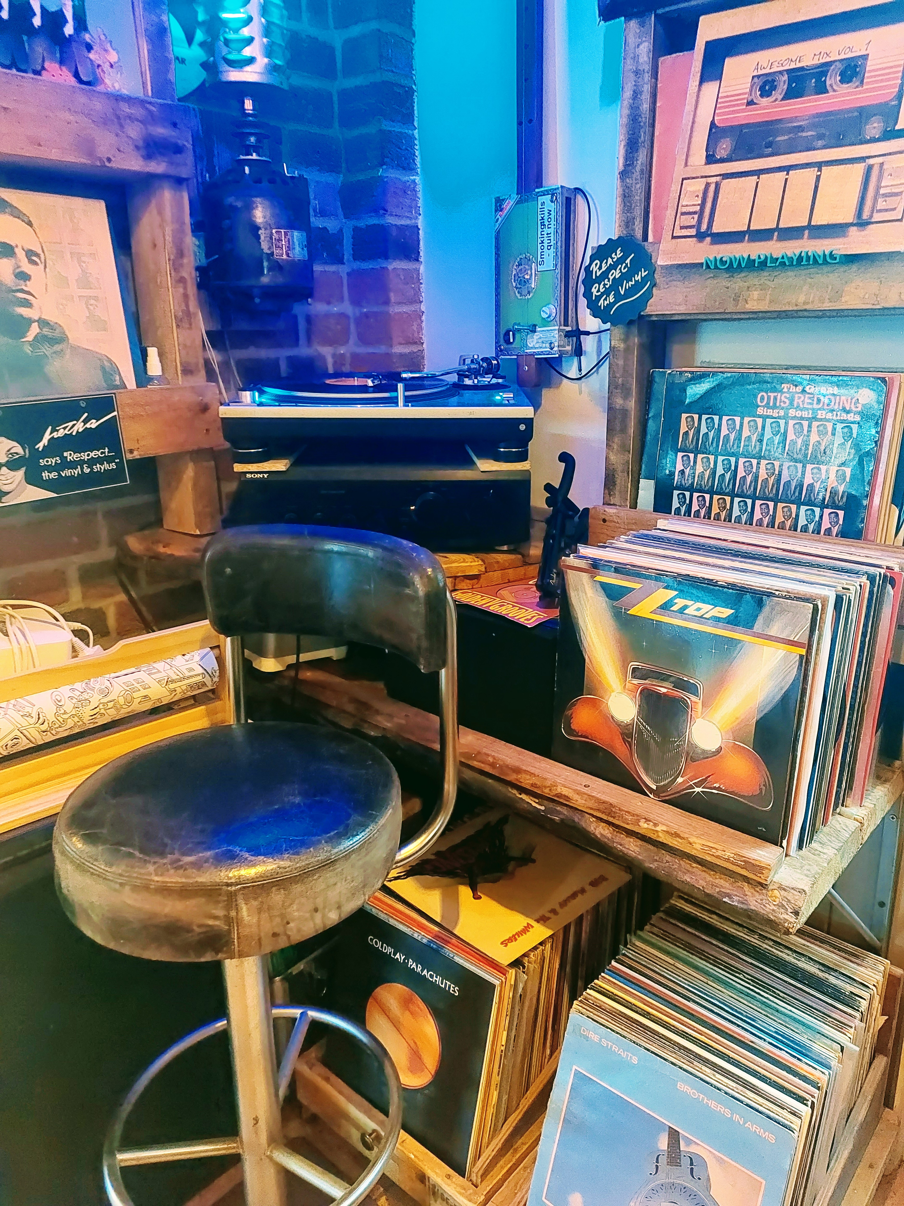 It’s a quirky place, a shrine to vinyl as well as a beery cafe. Spot your favourite ’80s vinyl on the wall.
