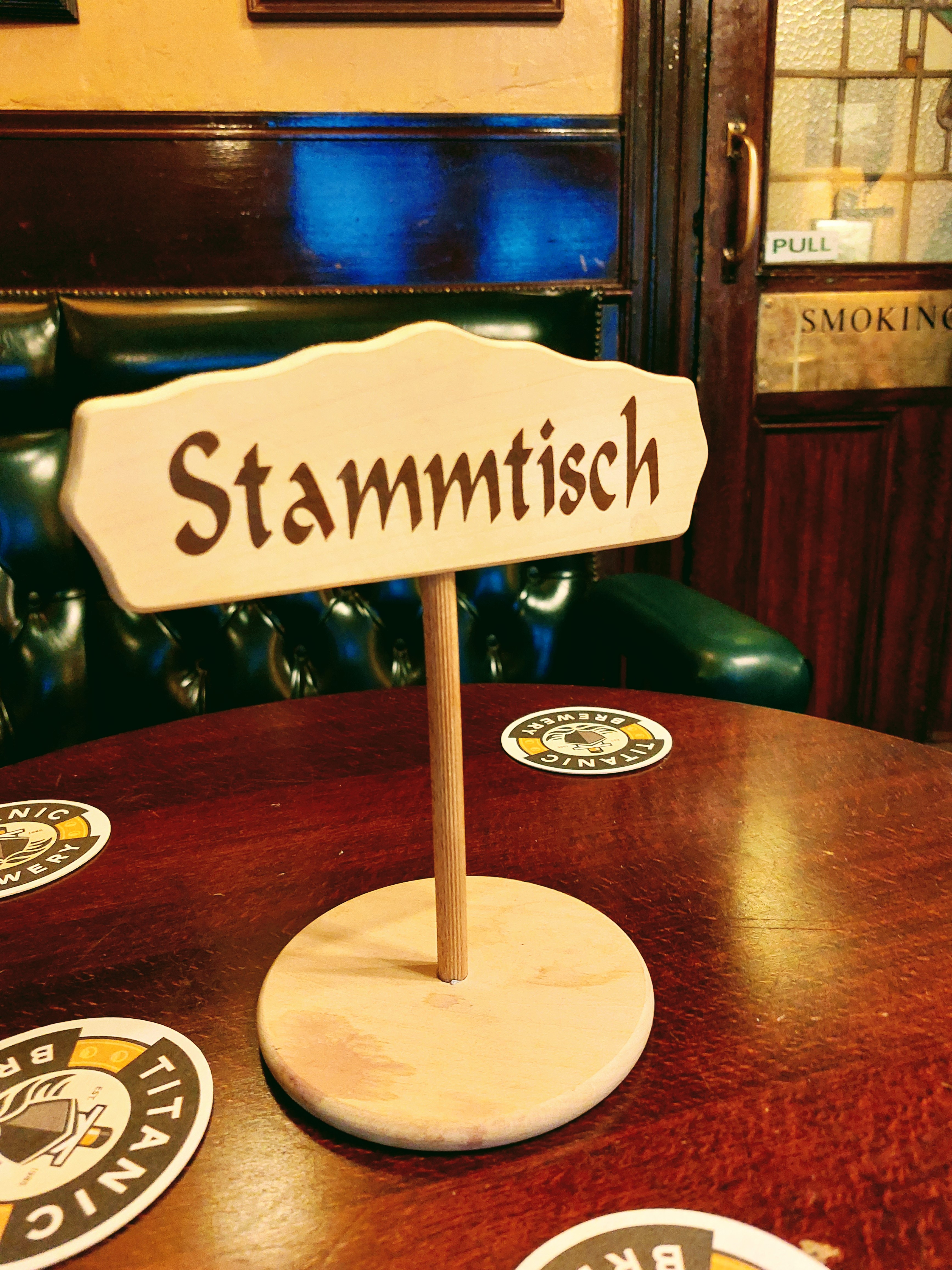 “Stammtisch,” table in a German pub reserved for regulars. Does this mean the City Arms isn’t a proper pub?