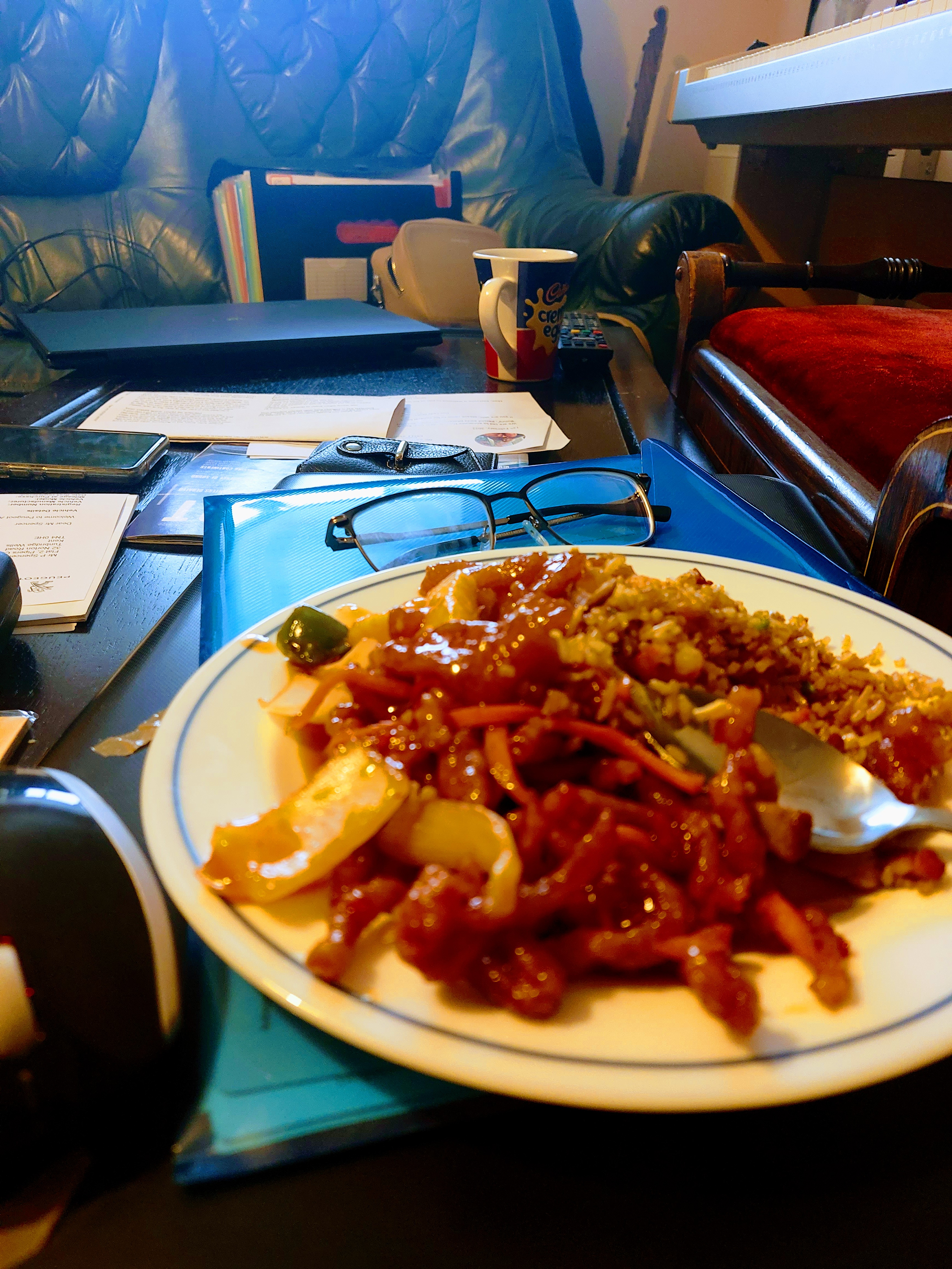 Reader, we had takeaways Wednesday AND Friday lunchtime. Special fried rice, Singapore rice, crispy beef and sweet and sour chicken Hong Kong rice, scoffed at noon in Paul’s flat. And Meow’s was cheap, friendly and prompt.
