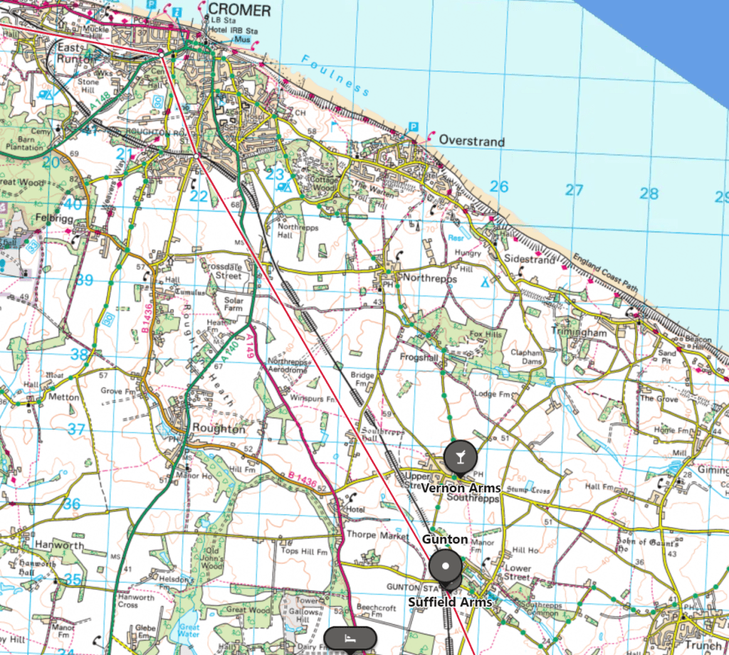 I’ve marked two other GBG entries either side of the Suffield. They’re all called “odd name Arms“; I was TORMENTED by the the fear I’d go in the wrong Arms, particularly as they’re all the sort of rustic gastropub that exist entirely for holidaymakers from Overstrand.