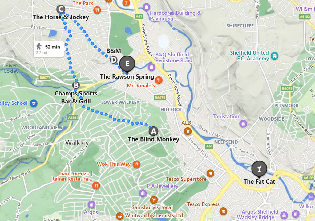 Easter Sunday 2022. He is risen. Mrs RM rose about 11:12, and joined me for a walk to the Rivelin Valley, which unexpectedly led at Champs Sports Bar (I spy a handpump) to a diversion up the hill to the Horse & Jockey, No. xyz on my famous All The Pubs In Sheffield…On Foot ! series.