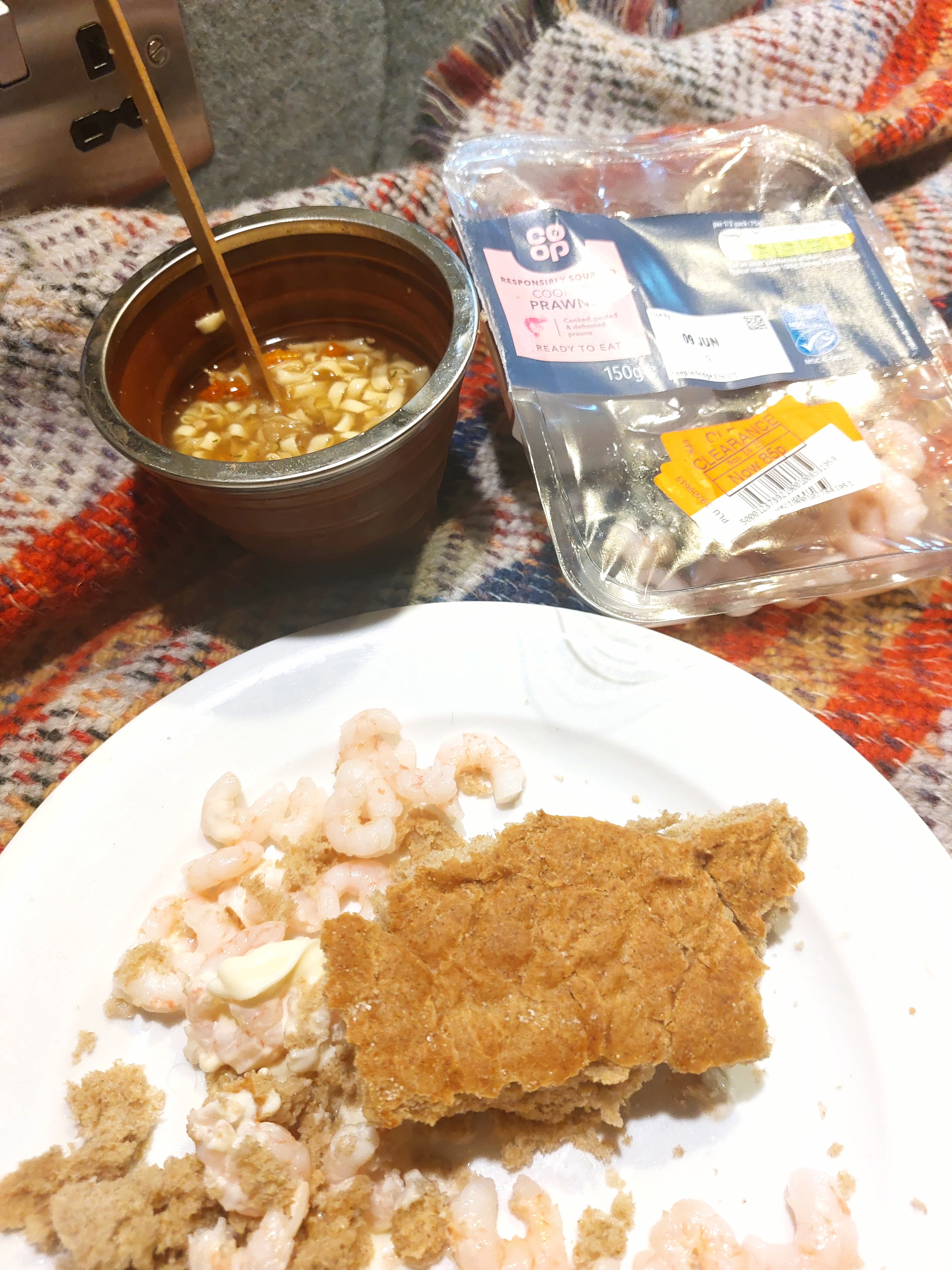 An early night with tea in the campervan; a feast of Co-op prawns reduced from £3.29 to 55p and ALMOST in date.