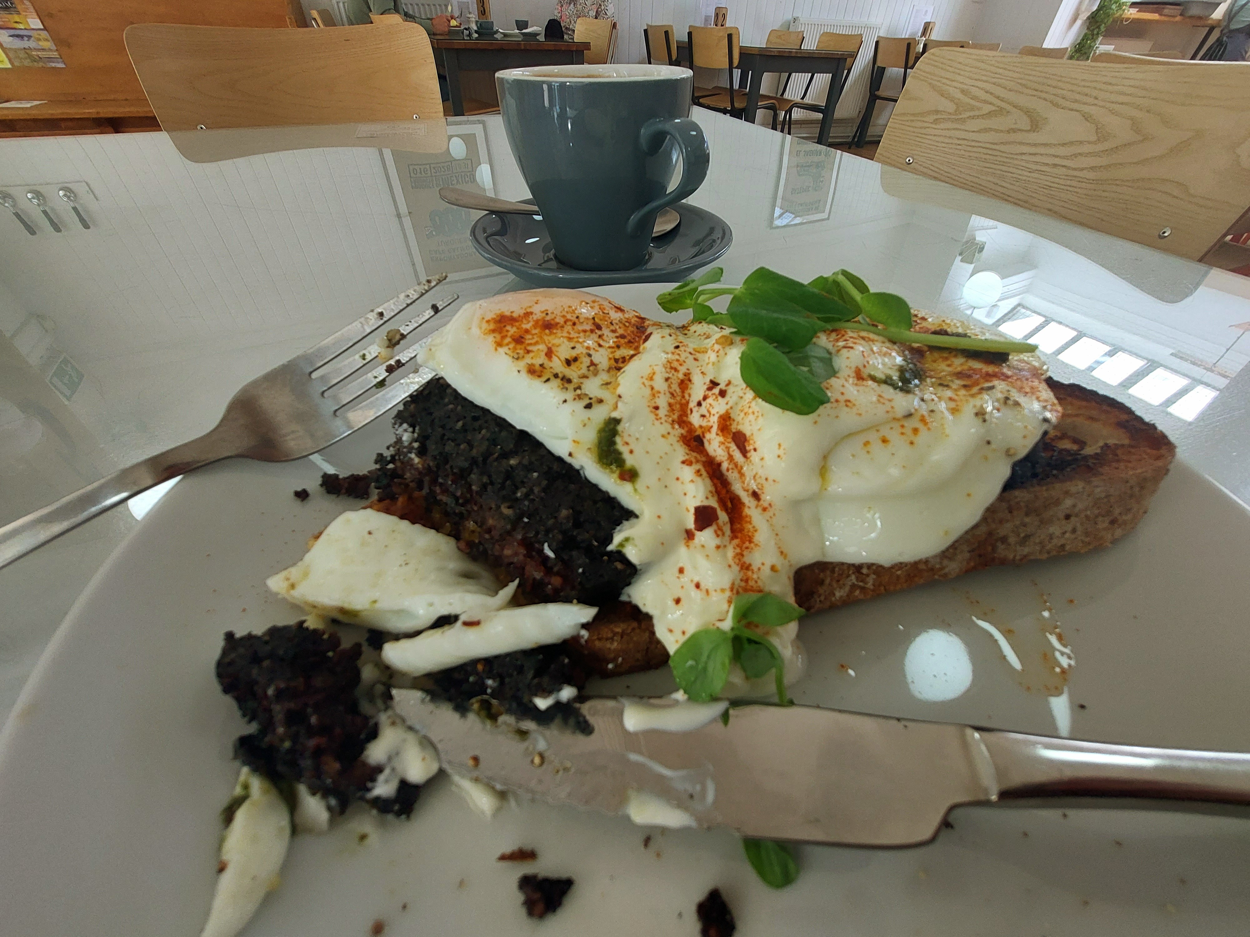 Poached eggs and haggis in curry sauce on sourdough for breakfast. Mmm. I know how to live on the edge.