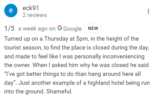 Loads of praise, but here’s a selection of the negative reviews of the Ben Lawers on Google reviews;