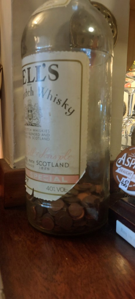 We took our usual table, to the right of the lounge bar, and tried to guess how much was in the charity bottle.