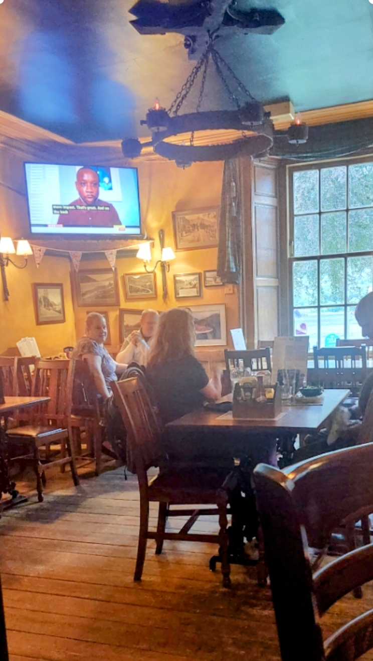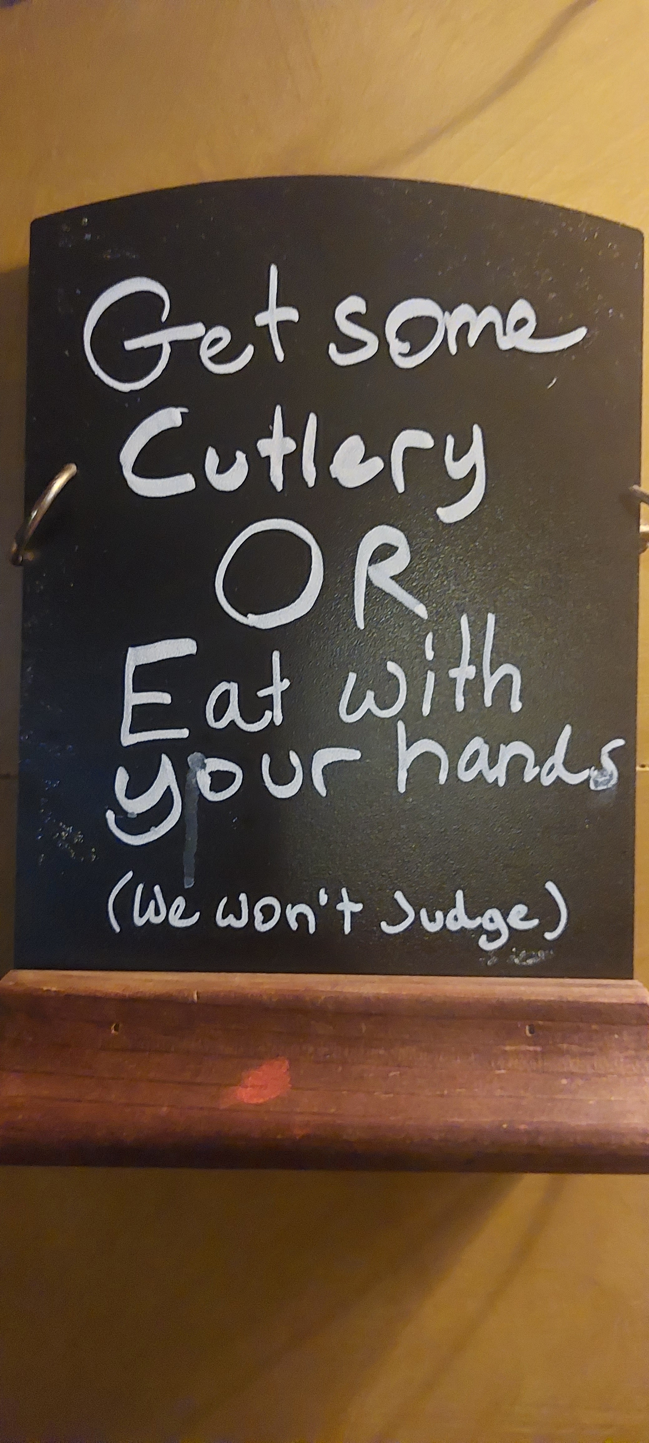 Everyone else is eating a huge burger (not with their hands), it’s all very jolly in a casual dining way.