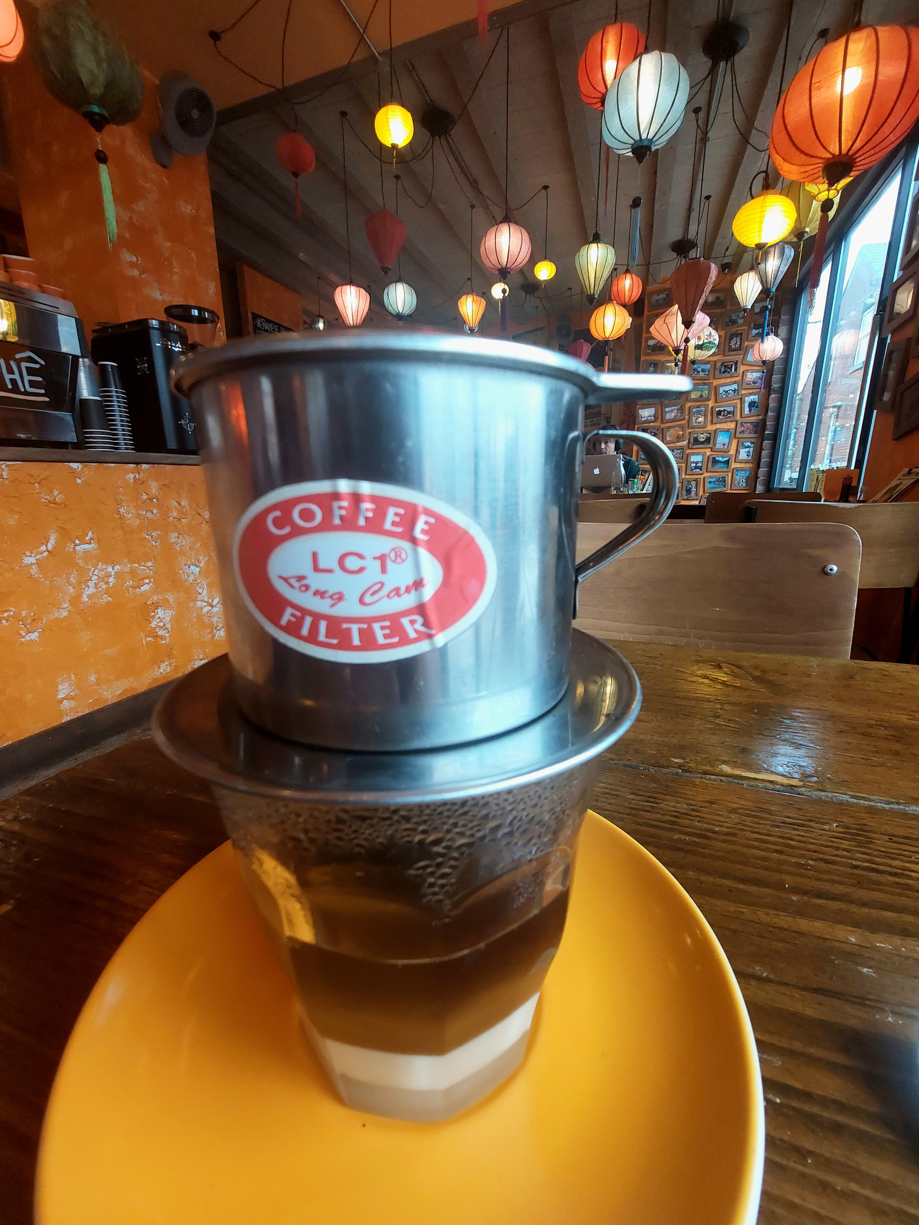 Two quick pints on a school night afternoon, oh dear. Time for a Vietmanese drip coffee from Nam Song on Sharrow Vale.