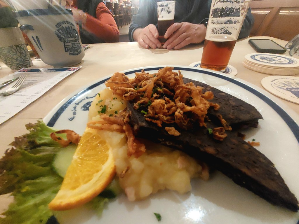 Plenty of trade for 19 euro Schnitzel, but we’re cultured and Joan and I had the black pudding, which was as good as at from that market in Bury.
