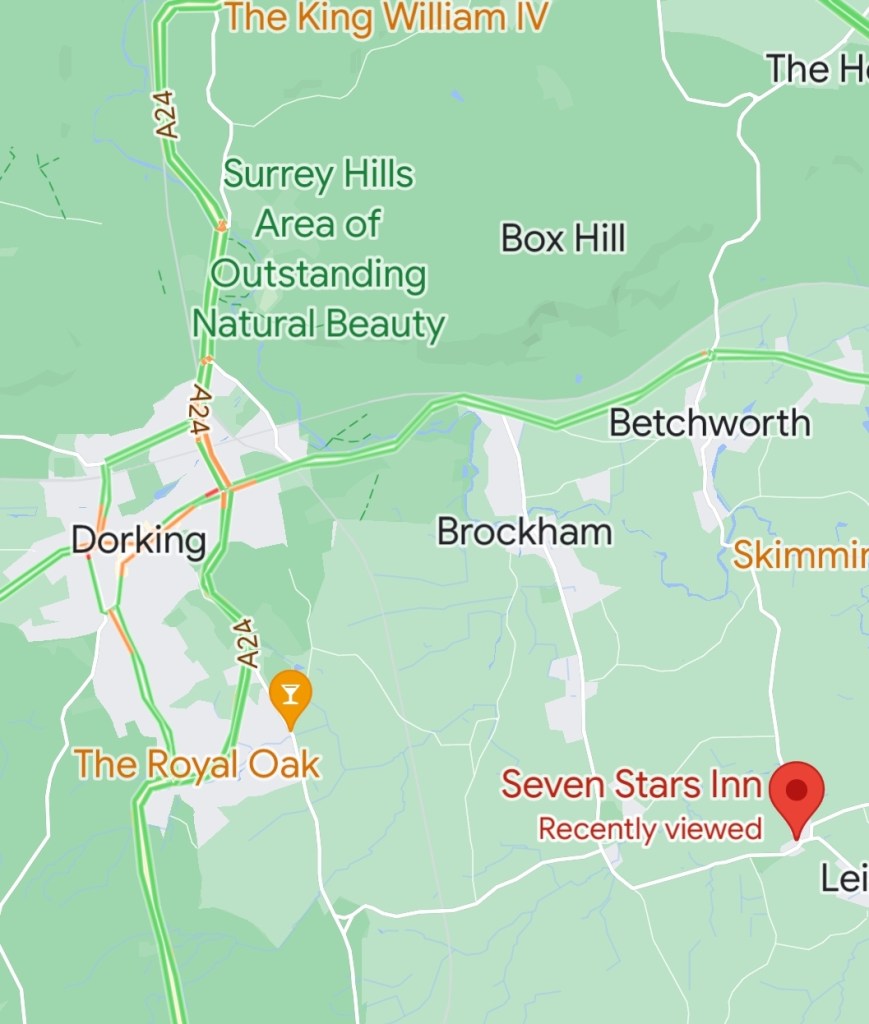 That’s not entirely fair, the hills between Horsham and Box Hill House some crackers. But the Seven Stars at Leigh is your identikit ancient gastro, with NUMBERED parking spaces.