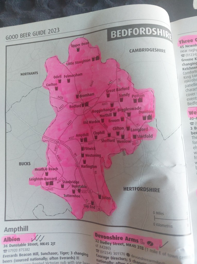 Bedfordshire must be my least-pubbed (GBG) county in England and Wales. I think the only pubs I’ve ever been in are the Cock at Broom and some pub in Leighton Buzzard we went to for a pub lunch on a work visit in the early 80s. I’m not going to rush to book a holiday, though. I remember an early edition of the “Good Pub Guide” complaining about the poor quality of pubs in the county.