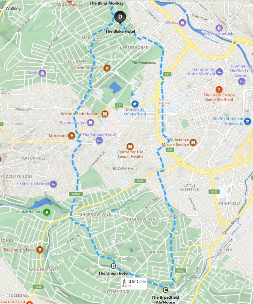 Google said an hour’s walk, down through student-land and gorgeous Endcliffe Park.