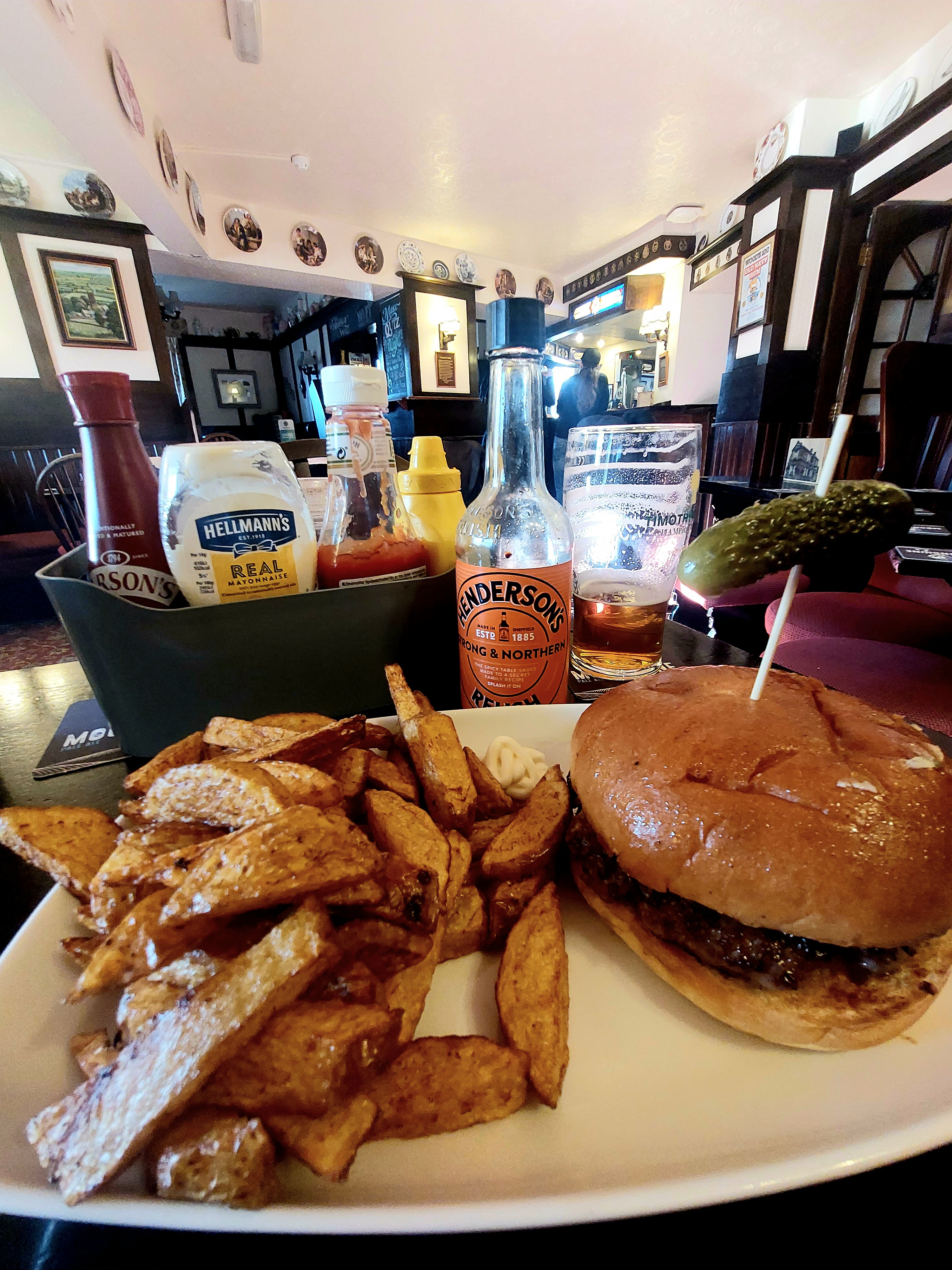 Boak & Bailey mentioned the menu, all under a tenner, and with half a dozen signs subliminally telling me to have a burger I had a burger. It was superb (NBSS 4.5) and I think you’ll agree the pickle on a stick is a winner.