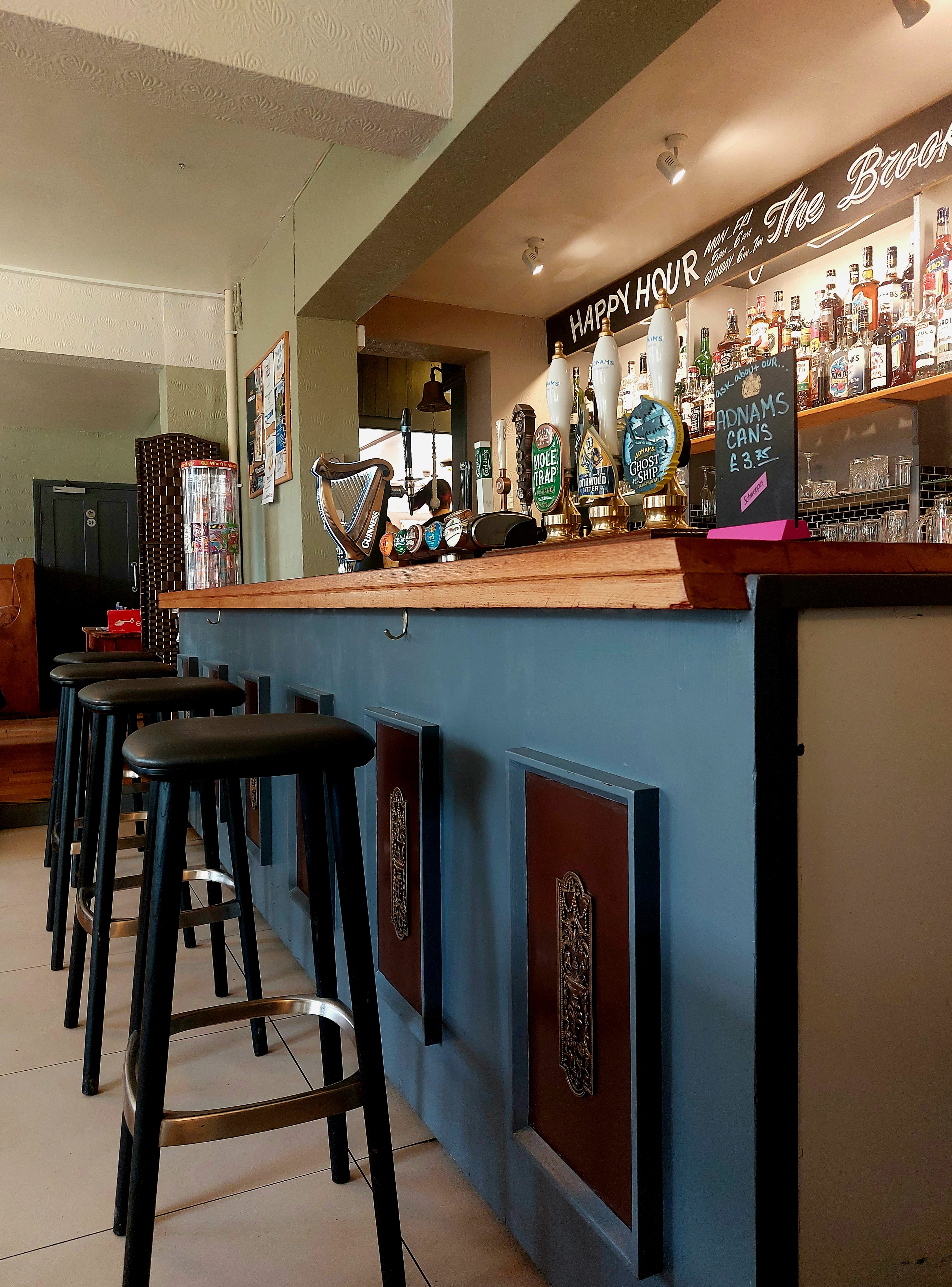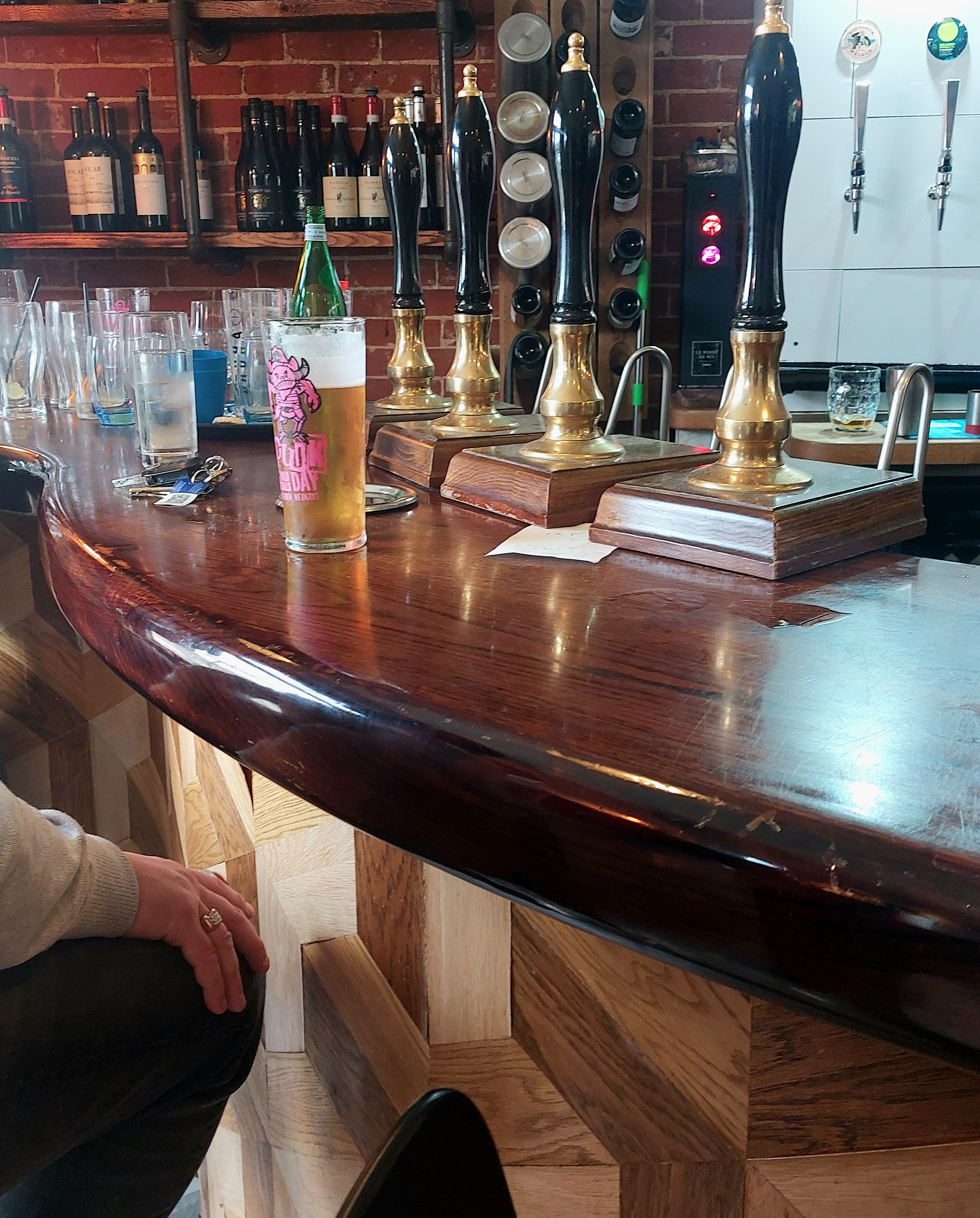 I squeeze into the bar and avoid the plates of food whizzing past my head. What’s on the pumps ?