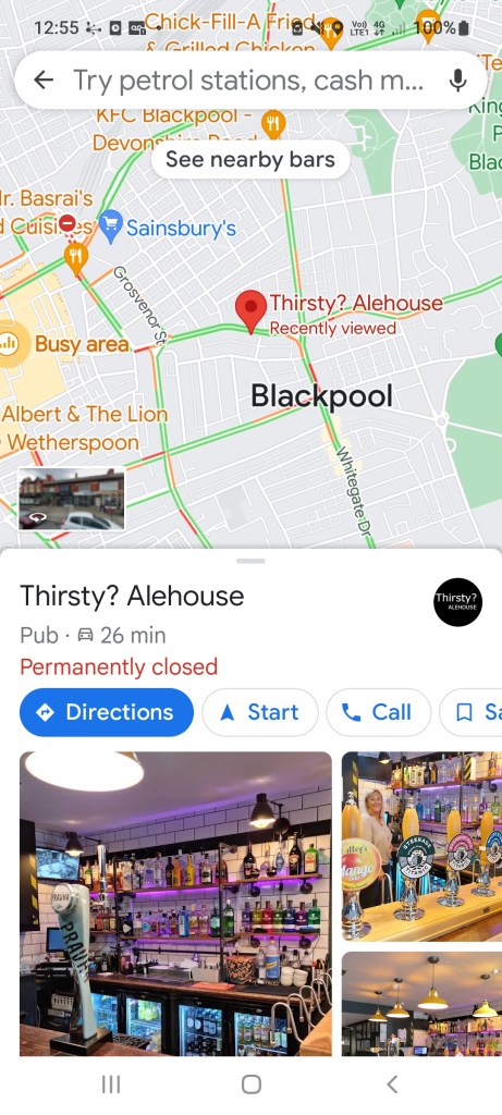 Further scrambling around revealed that JD Drinkwaters (NOT a Tenerife Spoons clone) was closer to Squires Gate station than “Pleasure” Beach, so I became the first person to leave the train there since 29th April 1978.