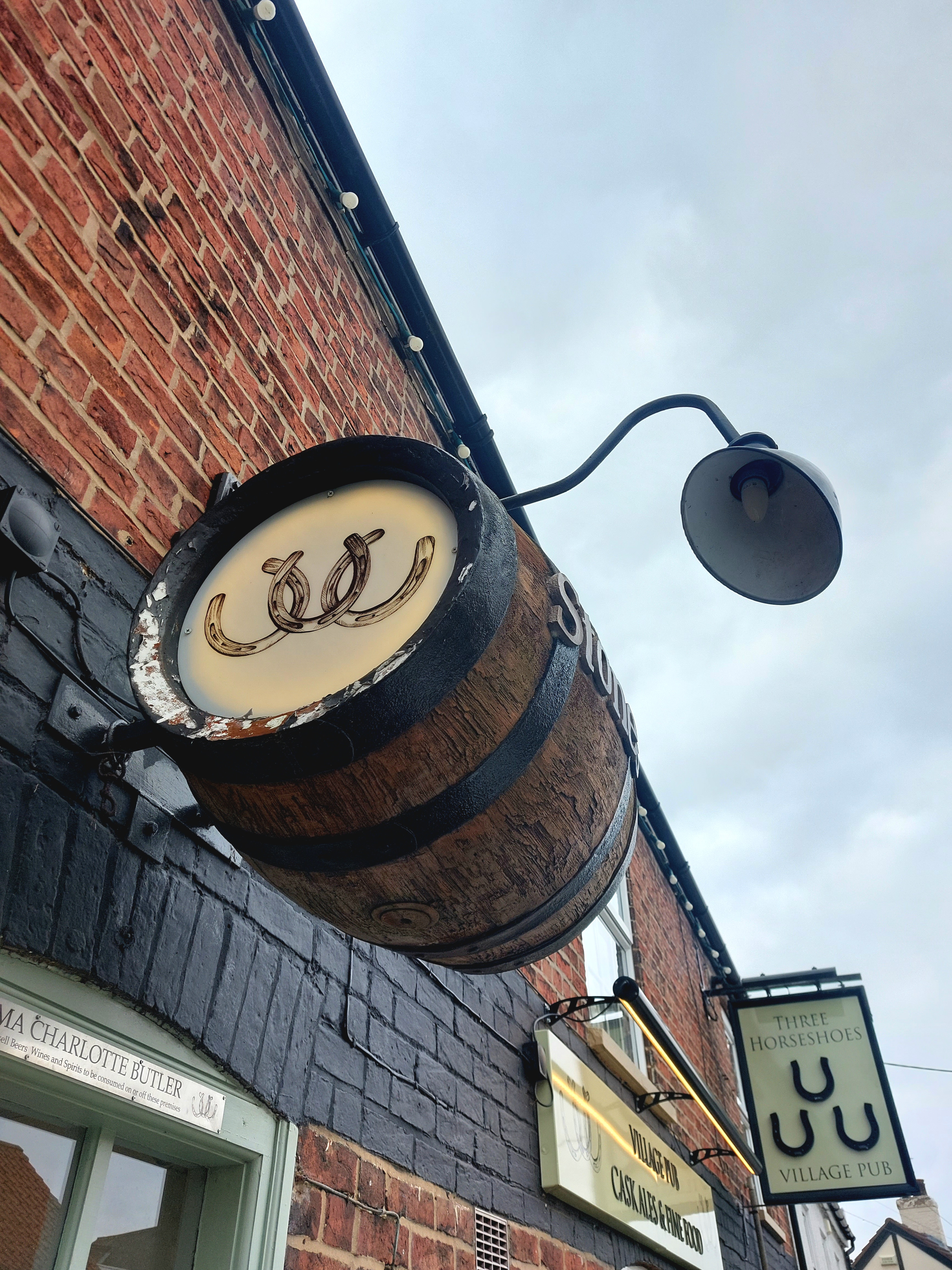 Inside the Three Horseshoes you’re greeted by a flurry of brewery signs. I like to imagine Paul Mudge has a room like this;